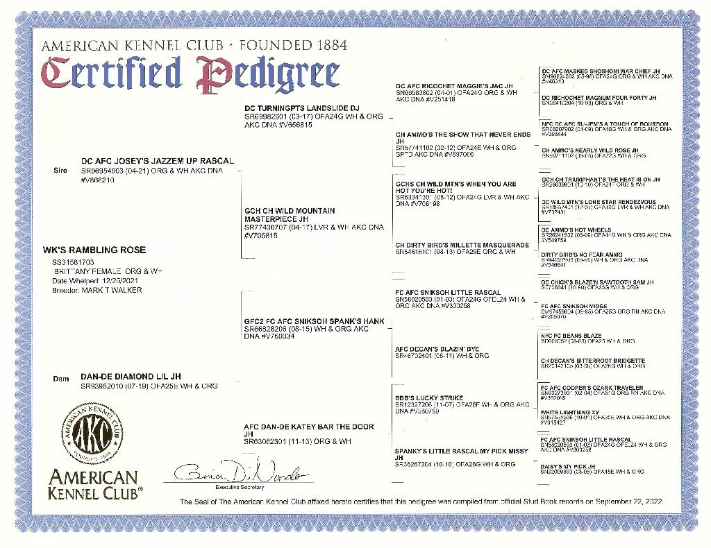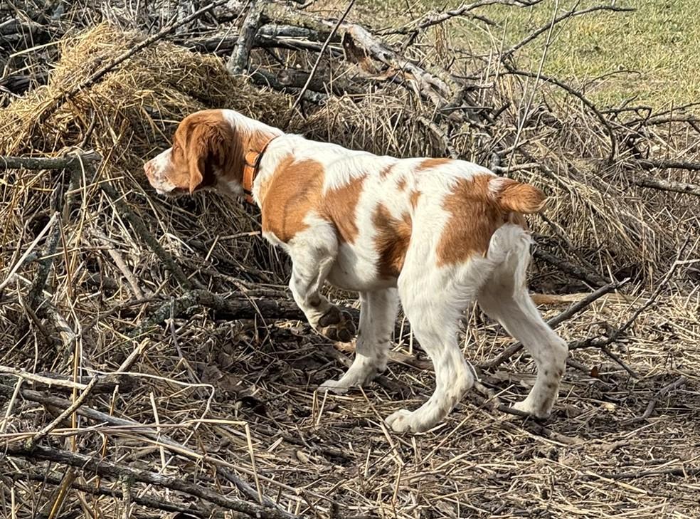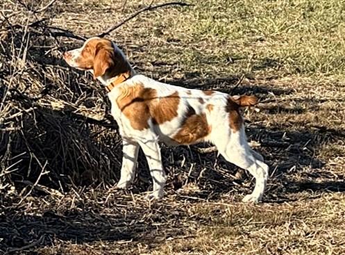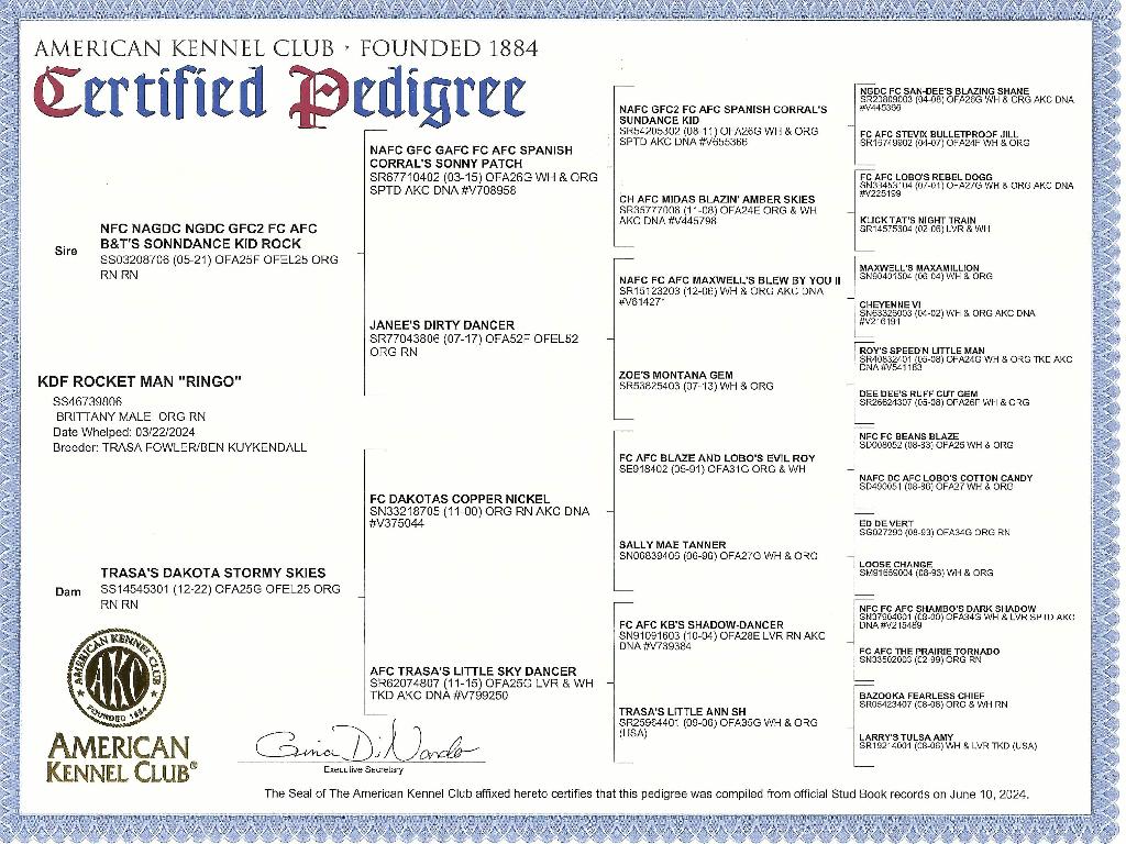 Sire: KDF Rocket Man “Ringo” is an exceptional young dog, known for his unique combination of a relaxed demeanor and a strong hunting drive. In the kennel. In the field, he transforms into a dynamic bird-finding machine with a swift, wide-ranging cast. Ringo showcases impressive orange roan coloration, conformance, athleticism, and endurance for all-day hunts. Trained alongside various dogs and handlers, and has hunted wild birds in ND, SD, and Kansas. Performance runs deep on both sides of Ringo’s family, his pedigree includes notable Brittany field trial performers and national and field champions such as his sire: NFC, 2xNAGDC, NGDC, GFC2 FC AFC B&T’s Sonndance Kid Rock. NAFC GDC GAFC FC AFC Spanish Corral’s Sonny Patch, NAFC GFC2 FC AFC Spanish Corral’s Sundance Kid, NAFC, FC AFC Maxwell’s Blew By You II, NGDC FC Blazing Shane, NFC FC Beans Blaze, NFC FC AFC Shambo’s Dark Shadow plus many more FC and AFC champions. (See his pedigree in pics)