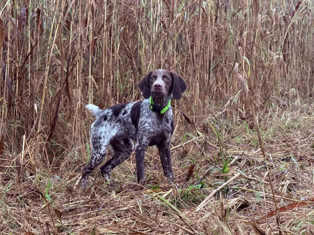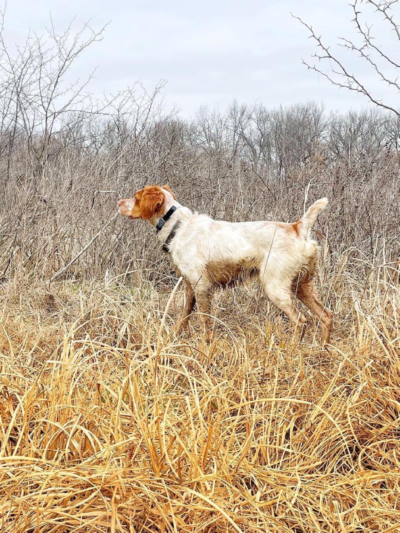He is a nice young male who has been exposed to everything you would want a bird dog puppy exposed to. Various types of mid west cover ( Hedgerows, tall sudan, Milo, and native grass). Exposure to crossing small creeks and finding water, and introduced to going under fences. He’s flash pointing anr Holding for a small amount of time and chasing pheasants, chuckar, and pigeons.