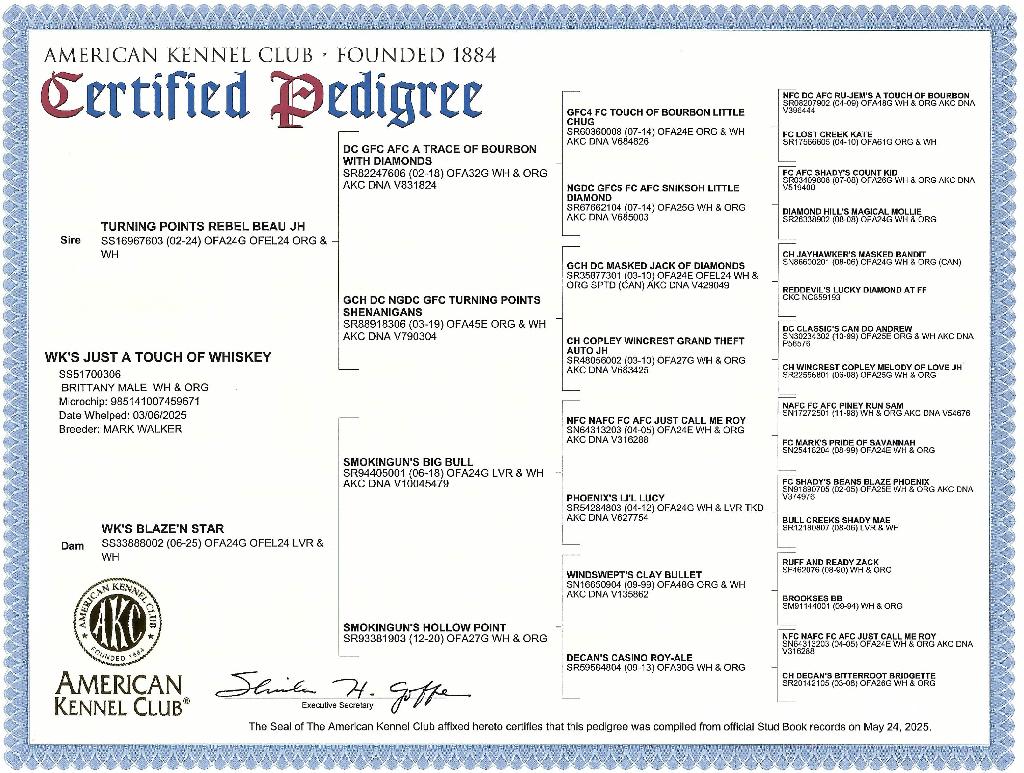 Roy was whelped here at the kennel from our Beau and Nova dogs. They are both proven field performers and can be viewed on site along with Roy. They both come from a long line of proven performers and field champions. Notables include GCH DC NGDC GFC Turning Points Shenanigans, DC GFC AFC A Trace of Bourbon with Diamonds, NFC NAFC FC AFC Just Call Me Roy, NAFC FC Piney Run Sam, NGDC GFC5 FC AFC Sniksoh Little Diamond, GFC4 FC Touch of Bourbon little Chug. See his pedigree in pictures.