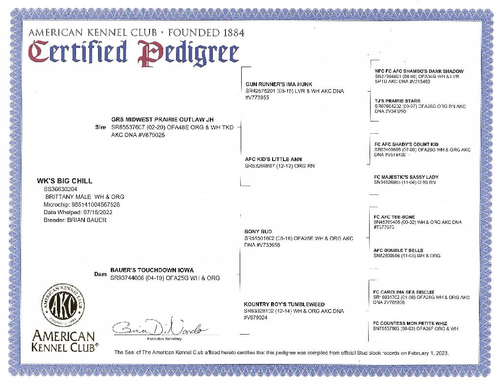Her Dam: Rose exhibits all the traits of an exceptional bird dog. She has desire, boldness, independence, bird-finding ability, pointing style, and trainability. Rose is calm both in the kennel and at home, making her a joy to be around. She has been trained and hunted with various dogs and handlers, earning her AKC Junior Hunter title at 9 months of age under the guidance of Amy West. She is OFA Good. Her pedigree boasts a lineage of distinguished performers and show winners, including NAGDC GCH DC AFC Triumphant’ s To Hot To Handle, NFC DC AFC Gambler’s Ace In The Hole, NGDC 2X DC AFC Winchester Of Hanging Jaze, NGDC DC AFC Magnum’s Masked Man, DC AFC Masked Shoshoni War Chief, and NFC DC AFC Ru-Jem’s A Touch of Bourbon, FC AFC Sniksoh Spank’s Hank, whose littermate was NFC Roustabout’s Flat Out. Her pedigree includes NFC FC (HOF) Beans Blaze, NFC DC AFC Gambler’s Ace In The Hole, FC AFC (HOF) Blaze Dakota Trucker, FC AFC Chubasco II, and DC Chick’s Blaze’N Sawtooth Sam. (See her pedigree in pics)