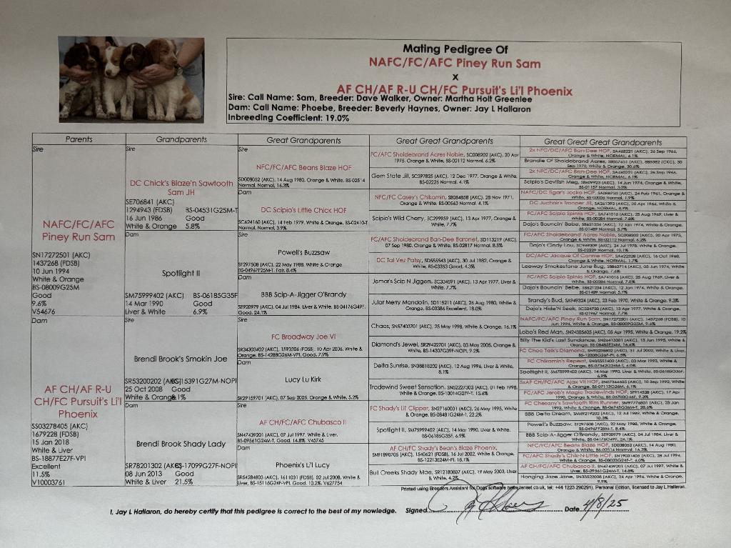 Our dam, Pursuit’s Li’l Phoenix (Phoebe) became an American Field Champion, a Runner-Up Field Champion and an AKC Field Champion when only 3 years old. She is OFA excellent for hips. The sire, Piney Run Sam (Sam), was a National Amateur Field Champion, AKC Field Champion and and AKC Amateur Field a champion. He was OFA good for hips. Sam also the sire of one of the most prestigious National Field Champions, National Amateur Field Champions and Hall of Fame members in Brittany history, Just Call Me Roy. This Sam x Phoebe litter is a frozen semen litter. We do not do repeat breedings so this is a “one and only” litter that will never be offered ever again.
