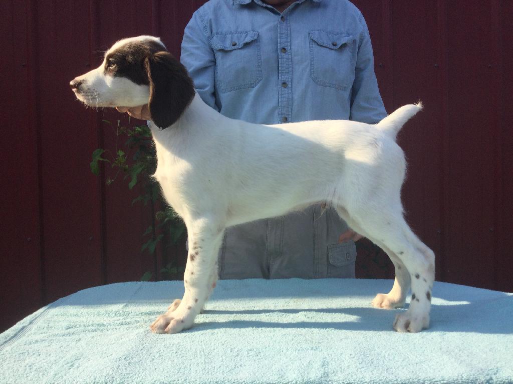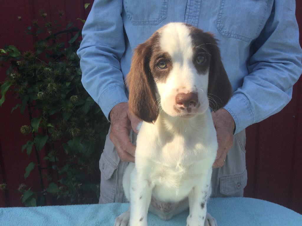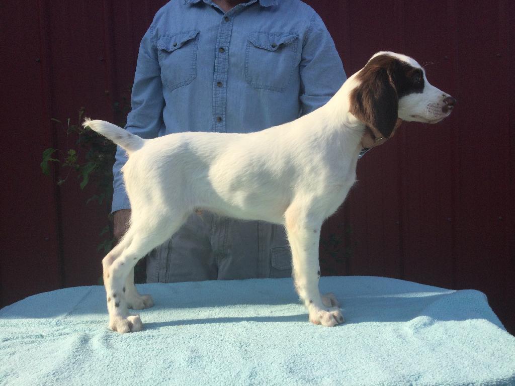 The litter whelped March 22, 2025 with seven healthy pups. We have 3 white and orange females, 1 white and orange male and 3 white and liver males. Currently 1 female remains unreserved. All of the males are available to new homes.
