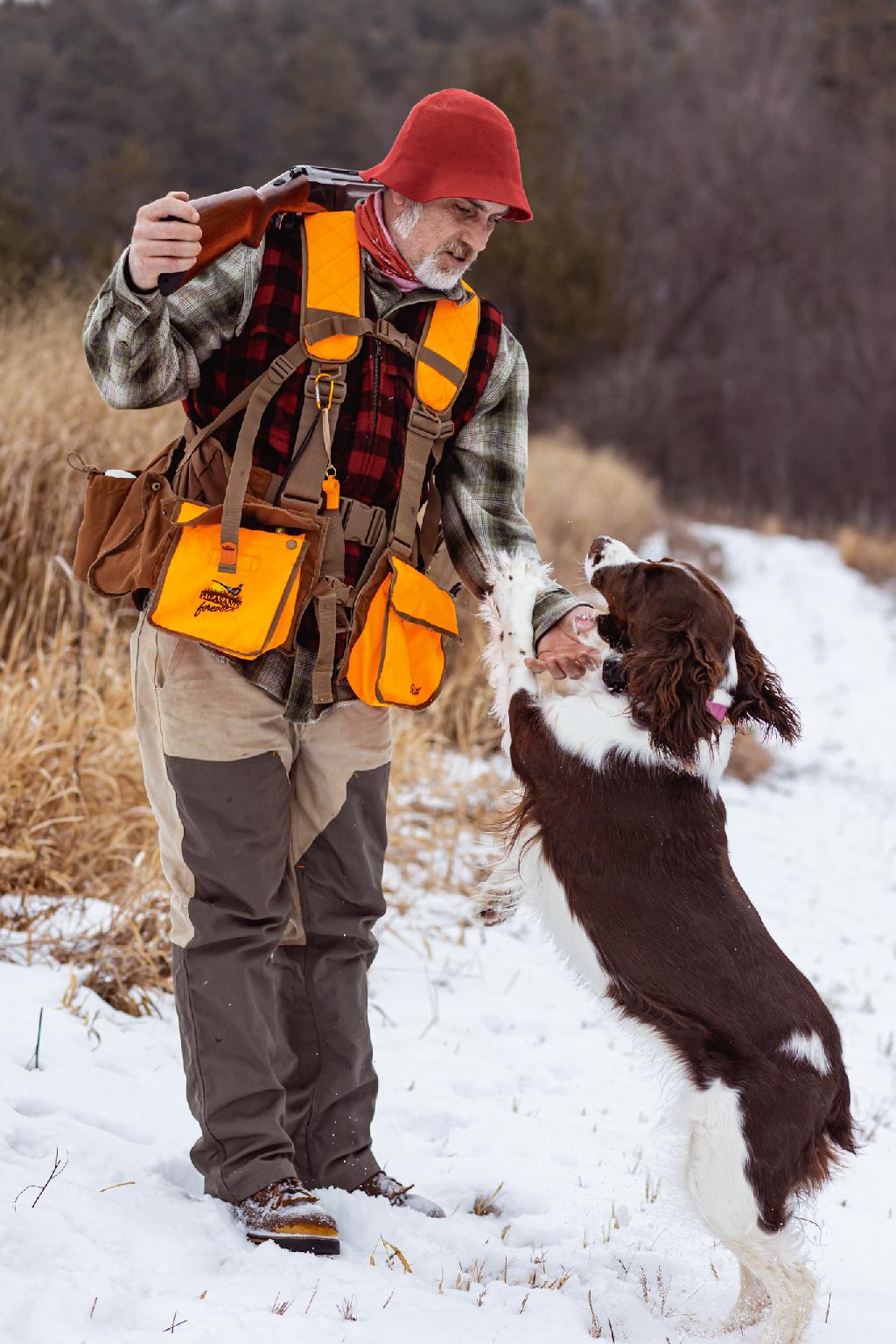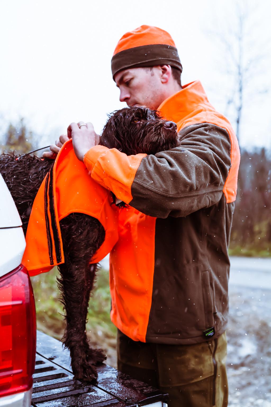 Dog vests can offer an added layer of protection from the blustery winds and can help to prevent dogs from becoming excessively wet, and subsequently cold. An orange vest also adds visibility for safety when big game seasons are still open or for otherwise keeping tabs on long-ranging pointing dogs. A form-fitting neoprene vest that retrievers wear can also help to keep your dog warm.
