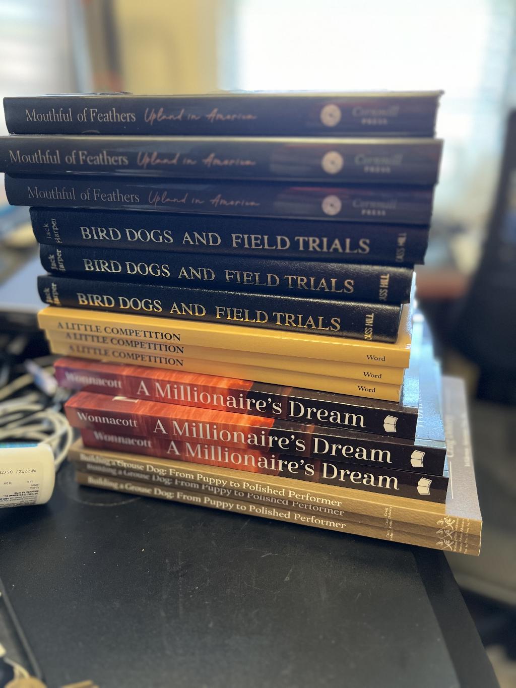 I have some great books to give away too! I have several Limited Edition hardback copy of Mouthful of Feathers (https://www.reidbryant.com) with an illustration by Frederick Stivers (https://frederickstivers.com). I have several signed copies A Little Competition by Tom Word. I also have copies of A Millionaire’s Dream by Bret Wonnacott, Building a Grouse Dog by Craig Doherty and Bird Dogs and Field Trials by Jack Harper.