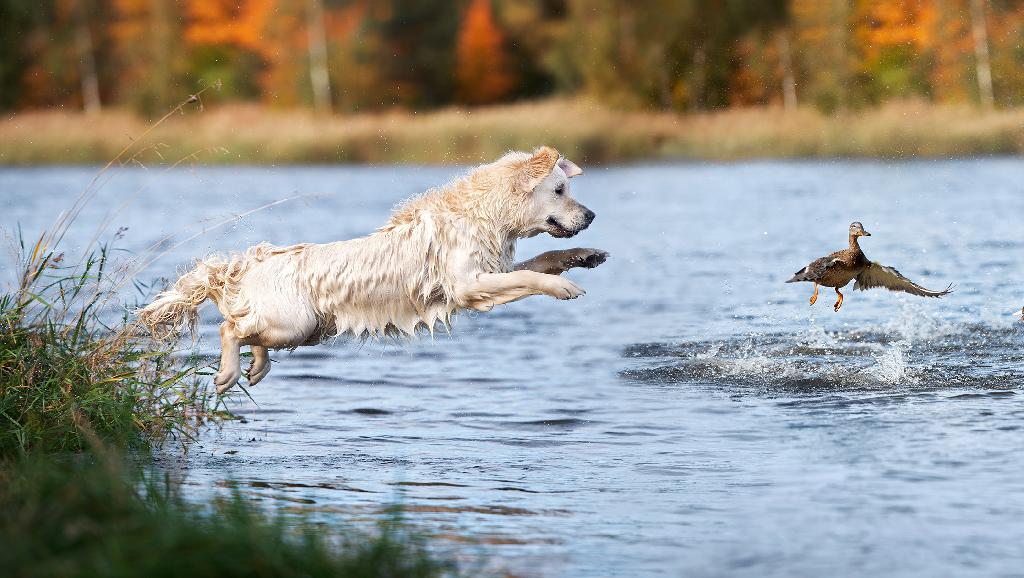 3. Golden Retriever : Golden Retrievers are well-regarded as both family pets and duck hunting companions. They have a gentle mouth, love of water, and enthusiasm for retrieving. Goldens are intelligent, trainable, and excel in marking and retrieving downed ducks.