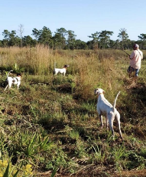 On this day of quail hunting myself and two close friends witnessed what we saw as an extraordinary event as it unfolded in front of our very eyes. To say the least we were astonished. Let me explain. My solid white setter named Snow went missing for a few minutes as we were hunting. My friend motioned for me to come look down in the 20’ deep creek bordering my ten acre training field. Snow was standing in 6 inches of water pointing a quail that was making its way up the steep embankment. Us three stood shoulder to shoulder as my little female pointer Queenie had entered the creek as well. Two of us readied for a good shot as the bird took flight and we both hit the bird as it fell some thirty yards in the field bottom on the opposite side from us. In doing so Queenie climbed up the slope and picked up our prize quail. After making two big circles in the field as we whistled and called to her, she turned to our direction entering the creek down one side and up to our side with a magnificent retrieve to hand. All the while I had expected her to drop the bird, but she proved me wrong. She had not been the best at retrieving in her training prior to that day. It took us a while to get back to hunting as we all felt that nothing better would be achieved on that day at least. Never underestimate the drive of a bird dog when they want to please those walking behind. Oh, and by the way Snow was still pointed as all of this unfolded. We completely forgot about the other bird he had pointed so he just came up to us afterwards as to say(what about my bird?).