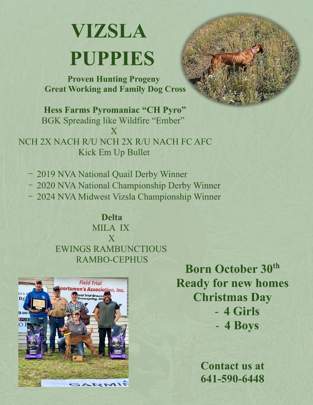 Avid dog lovers and bird dog enthusiasts. We love our dogs and love to watch them work. They live in the house year-round. This is not a business for us. We have a wonderful female Vizsla who is 3 years old, and we wanted a puppy from her.