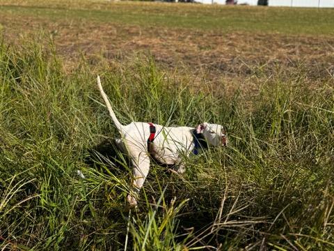 Steady to wing and shot. Steady with flushing dog. Got a super great nose on him! Hard hunting, high head, nice tail. Fast moving. Tone broke, whistle broke. Backs. Will retrieve if you let him. He would make a wonderful preserve dog.