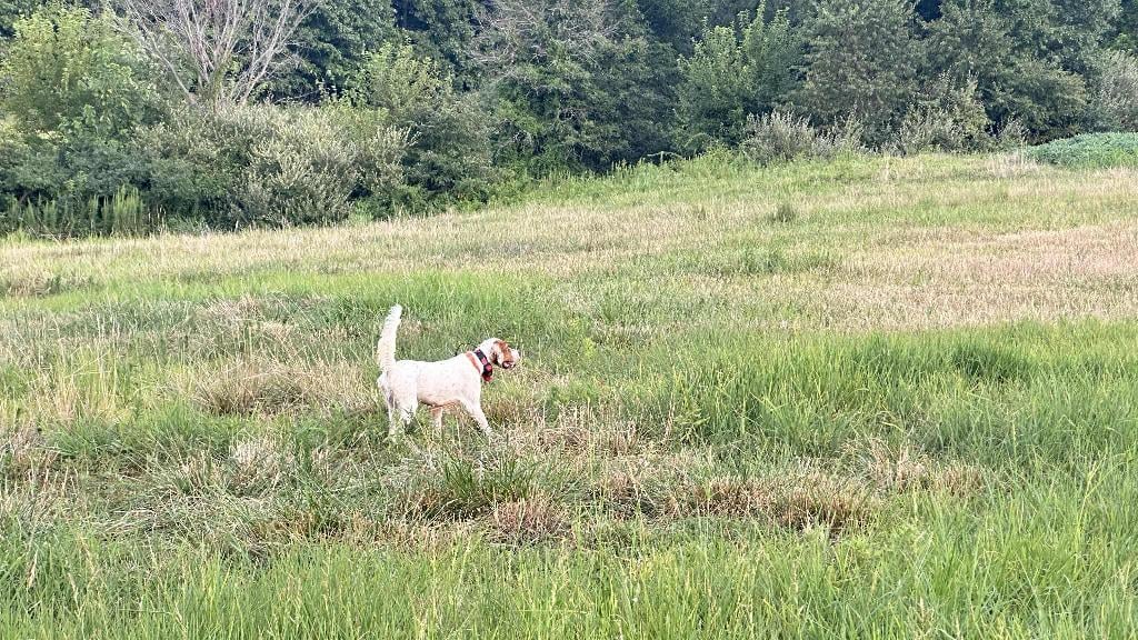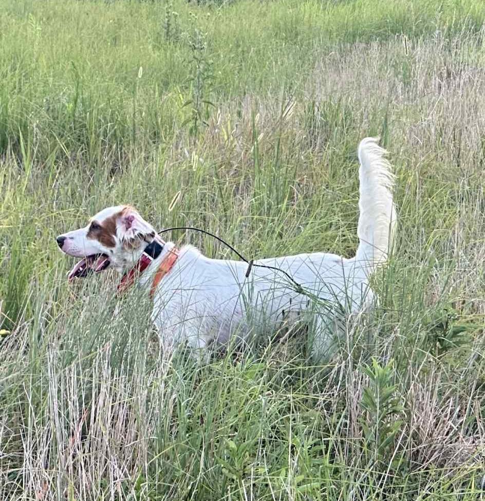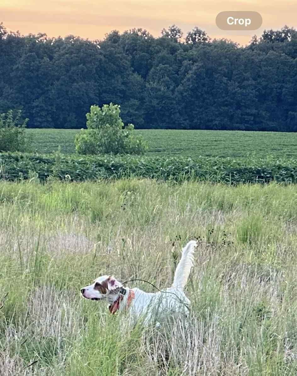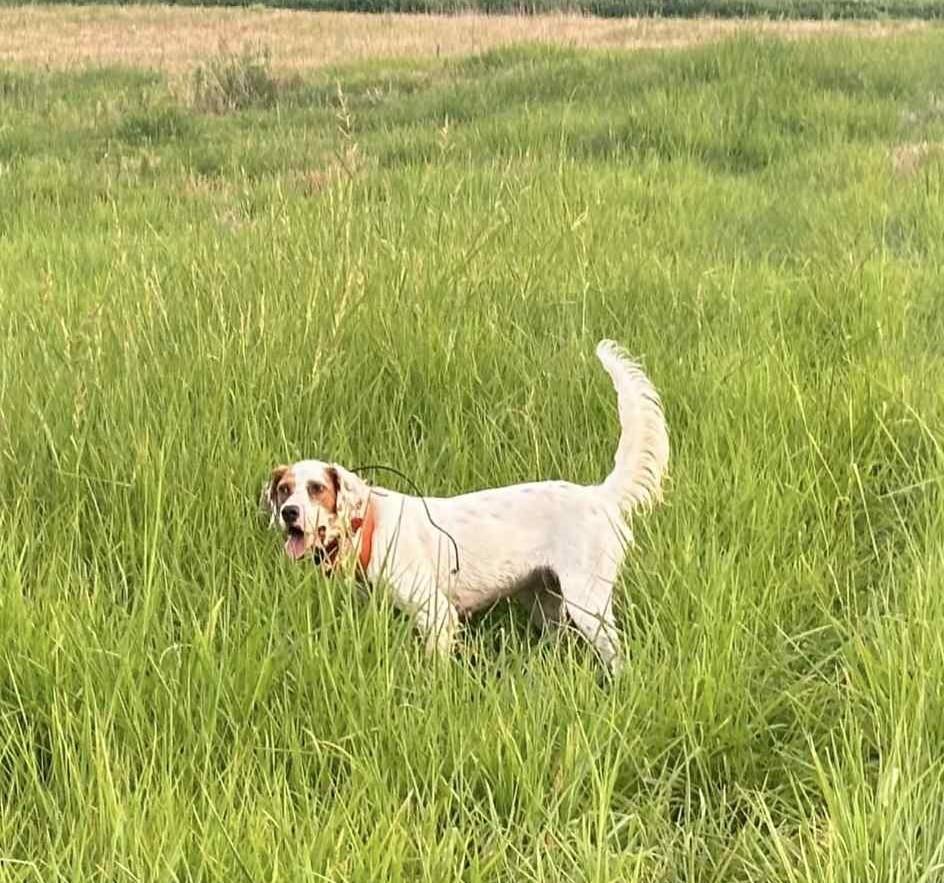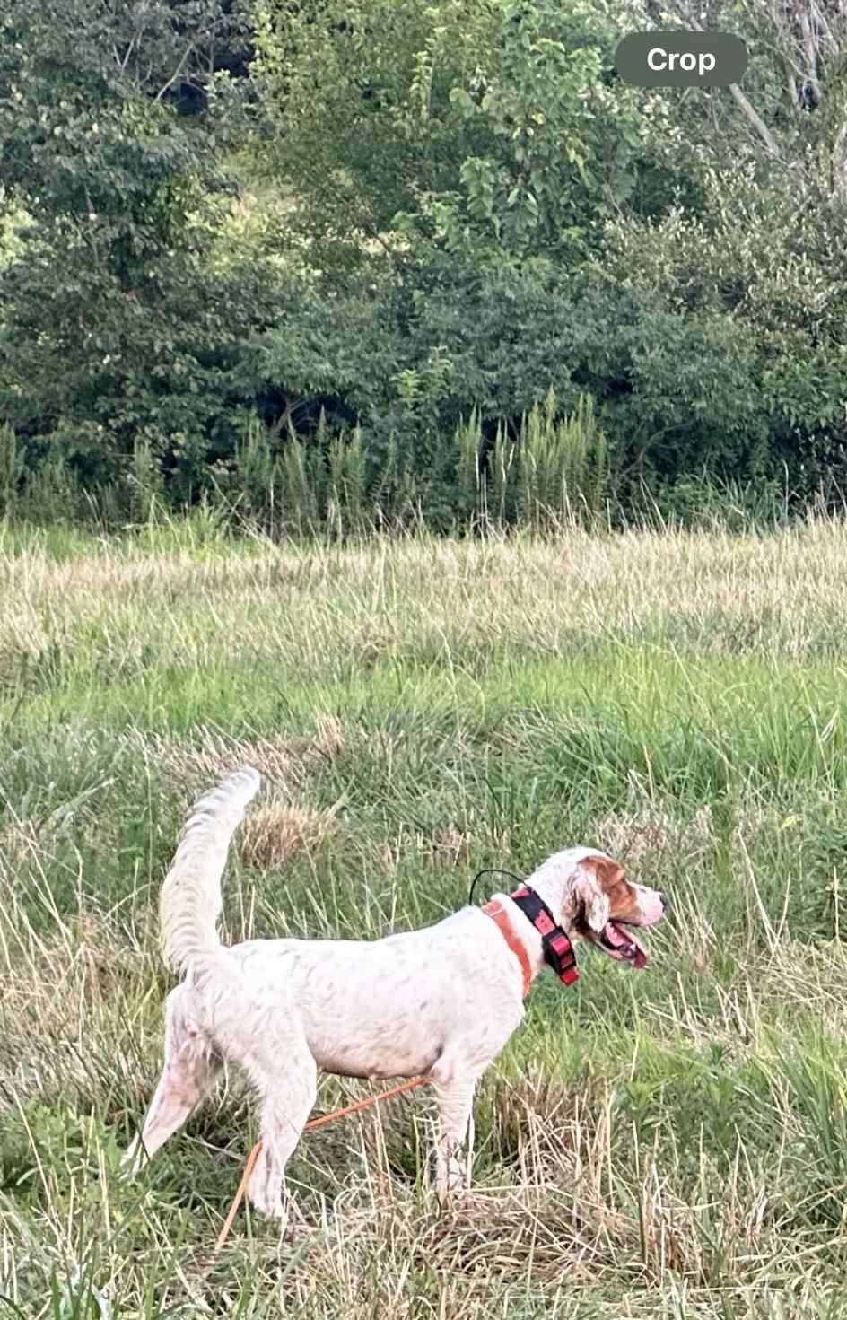 2 year old female setter ready to hunt. This dog will be a great hunting dog. Lots of drive, great nose, very strong pointing instinct. She will find birds for you. She handles very well, moderate range but can change depending the cover and is perfect for a foot hunter.