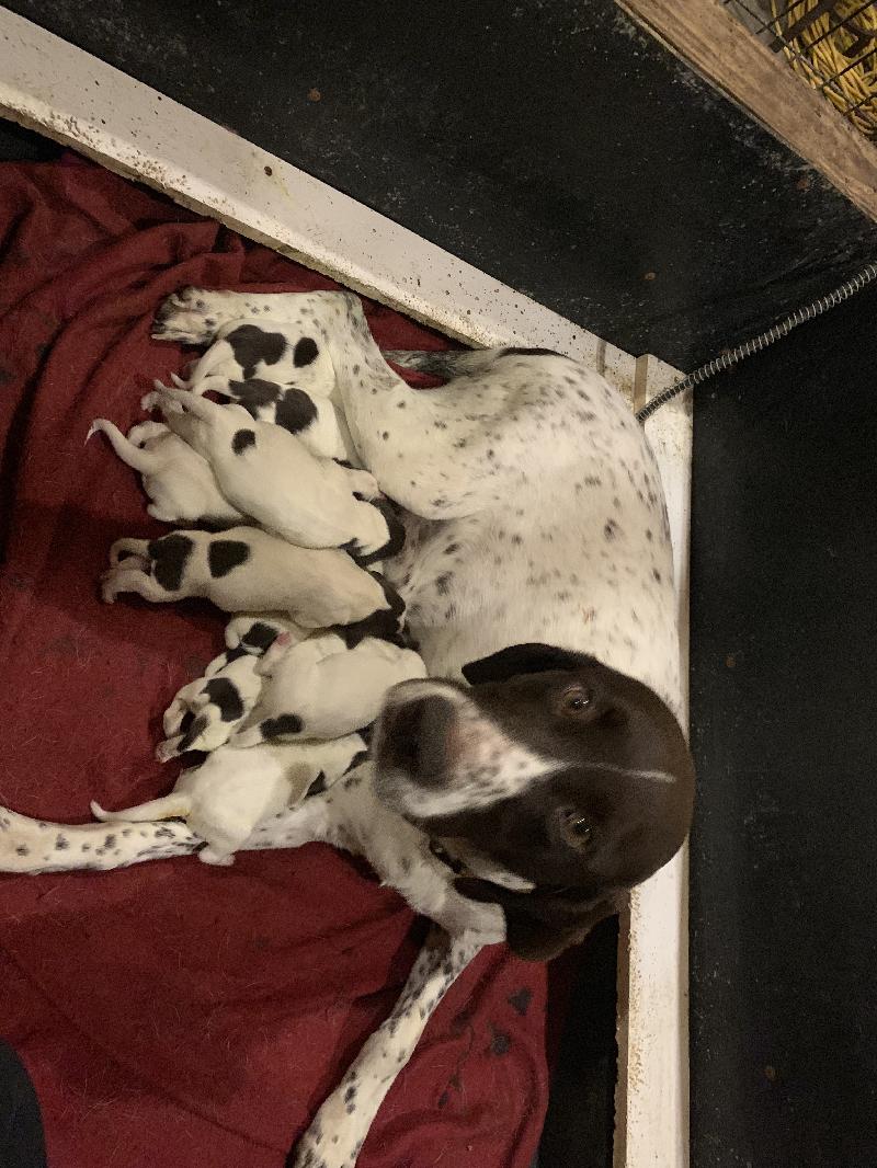 Lazy G Kennels has some exciting news ! On October 8 2019 we here at Lazy G Kennels were lucky enough to be able to welcome 9 healthy German Shorthaired Pointer Puppies to the world and Just in time for the Perfect Christmas Gift . The litter is out of two of our dogs here at Lazy G Kennels. The father is Lazy Gs Royal Jag and the mother is Lazy Gs Kimber. Jag and Kimber are both fantastic hunting dogs with natural retrieves, extremely biddable, and fantastic bloodlines. The German Shorthaired Pointer was developed to be a dog suited to family life as well as being a versatile hunter, and these puppies will surely be no different. Their temperaments are that of an intelligent, bold, boisterous, eccentric, and a characteristically affectionate dogs that are cooperative and easily trained! Jag is currently Junior Hunter Titled and working towards his Master Hunter. Whether you are looking for a indoor/outdoor family dog a hunting companion or both, these puppies are sure to please! These puppies were bred to be great family companions with the foot hunter in mind and will be nothing short of that.
