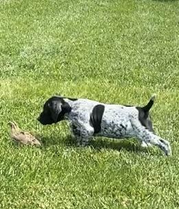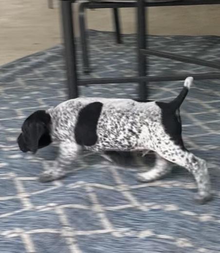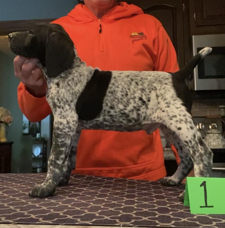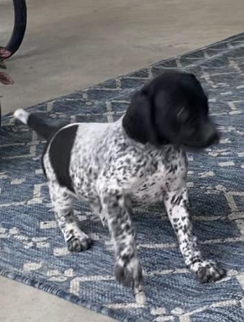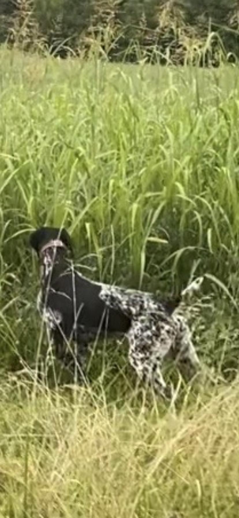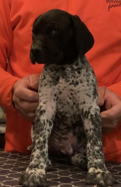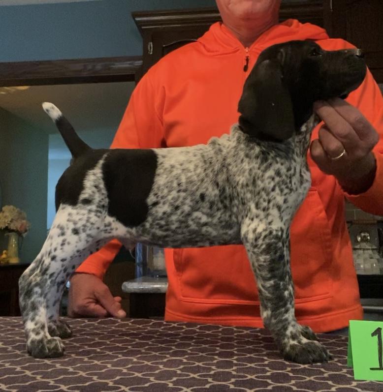 My husband and I have had four German Shorthaired Pointers and we absolutely LOVE the breed. We lost our beloved Kenny to bone cancer on February 1st. I immediately started looking for a GSP breeder. I contacted Rod and was quite impressed with his knowledge and love for the breed also. He sent me pictures of the parent dogs along with puppy pictures from previous litters. He was easy to talk to and took his time speaking with me. He said he has been breeding GSPs for four years. Rod researches the bloodlines and pays extra close attention to the details; he knows what he is doing!! He called me as the puppies were being born on March 18th. We went to look at the puppies in April and chose one that our seven year old grandson seemed to favor a lot. This past Sunday we went to bring our wonderful puppy home. He is such a GOOD puppy!! He is laid back, easy going and well adjusted. My daughter is a professional dog trainer and I asked her what she liked best about our new puppy and her response was his chill. I wholeheartedly give Rod a rating of 5 stars. He is more than willing to work with you to find the right puppy!! All our previous GSPs were liver and white ticked but JJ is black and white. His solid black head looks and feels like black velvet.