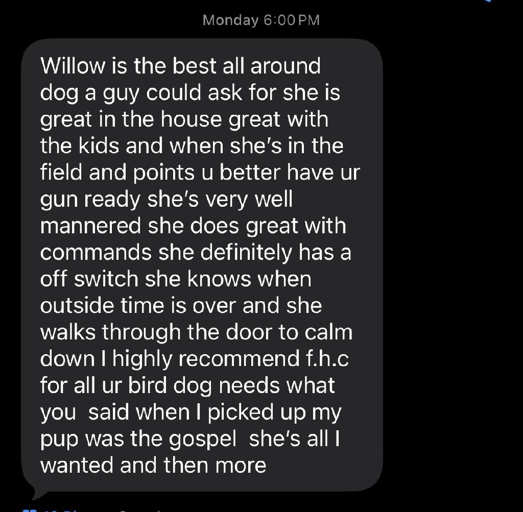 I reached out to Cody with many questions about his dogs and the litter. He was very responsive and we talked right away. He had a lot of good information to share about his dogs. He answered all of my questions and was very easy to talk to. Whether I purchase one of his puppies or not, I feel like I’ve met a fellow bird hunter I could call and talk with.