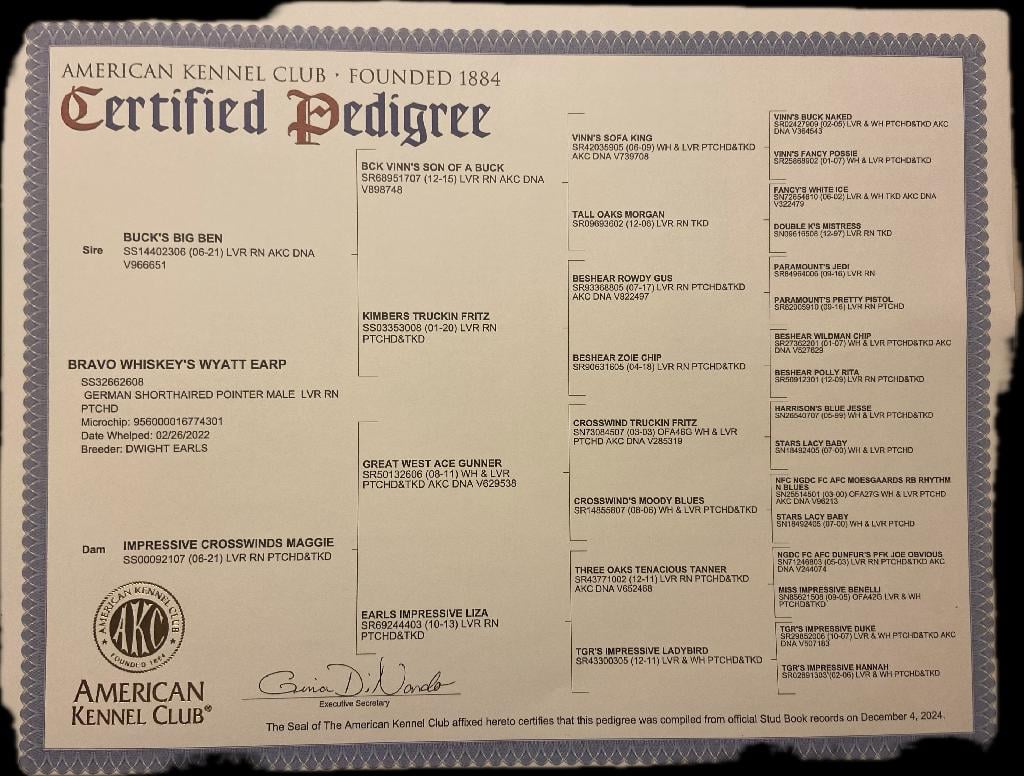 BRAVO WHISKEY GERMAN SHORTHAIRSKennel Account - Premium AccountDAVID PENN2995 DD HIGHWAY KOSHKONONG, MISSOURI 65692 United States |