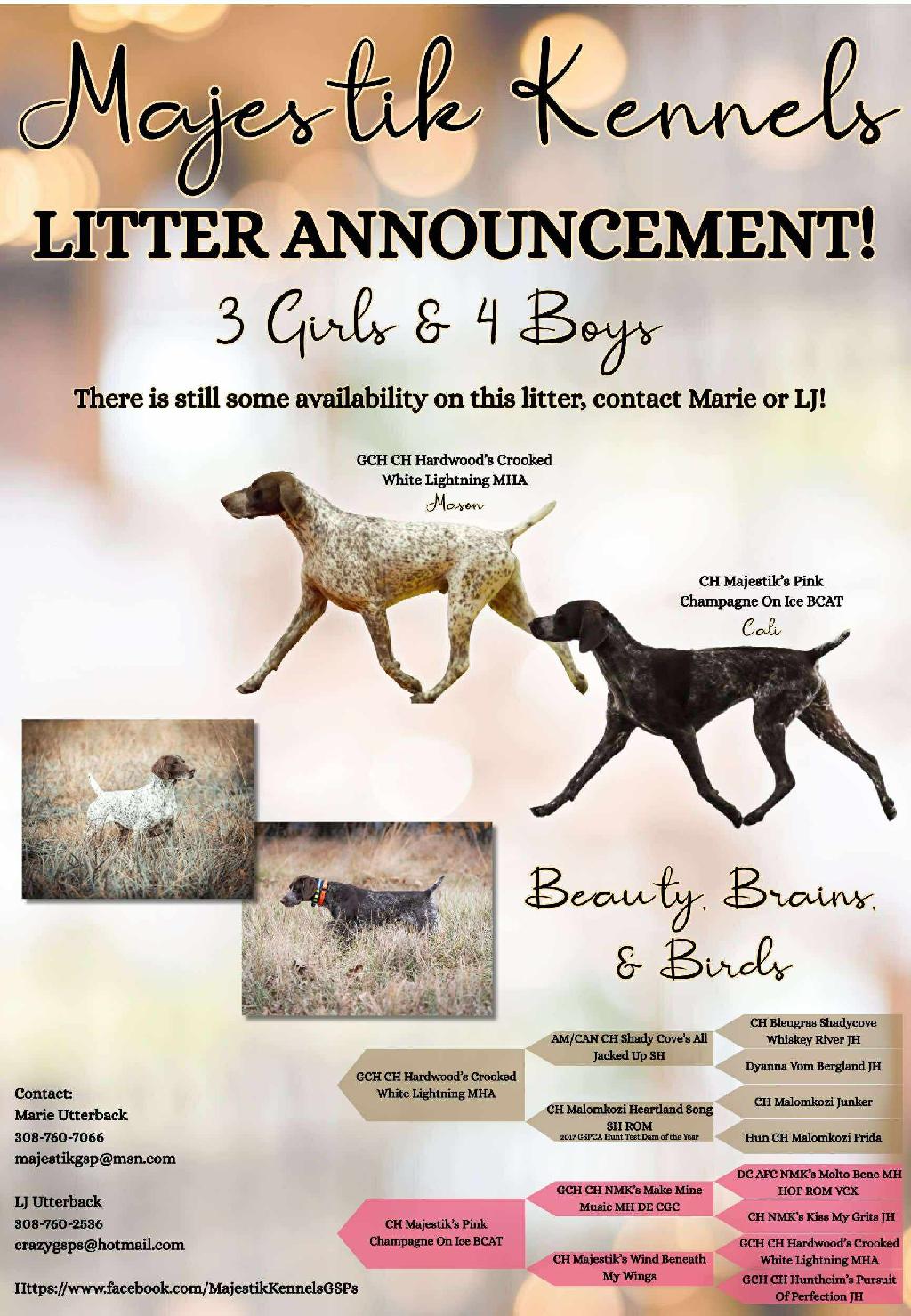 Litter is 15 weeks old. All puppies are AKC Registered, UTD on shots,and Microchiped. Parents are all health guaranteed. Puppies are naturally birdie, parents are AKC show and hunt champions. Father is a MH, mother is a JH. These puppies will make great, pets, hunting and show dogs. Very nice on-off switches!! Currently have 3 Males left! Also check out our Facebook page Facebook.com/MajestikKennelsGSPs for more pictures!! #gundogs #gundogcentral #huntingdogs #sportdog #fielddog #dogsofgundogcentral #germanshorthairedpointer #versatiles #puppiesforsale #forsale #gundogsforsale #huntingdogsforsale #male #gchchhardwoodscrookedwhitelightningmha #chmajestikspinkchampagneonicebcatjh #alliance #nebraska