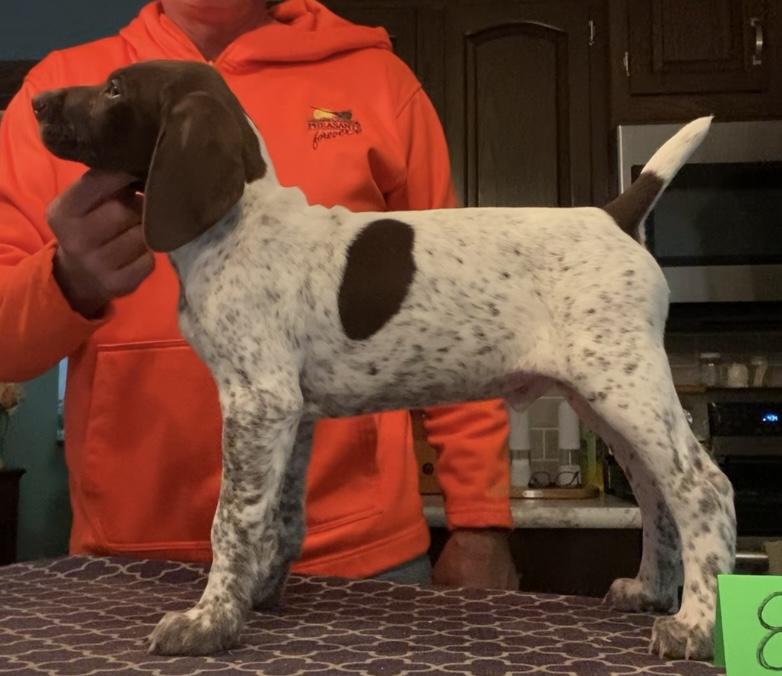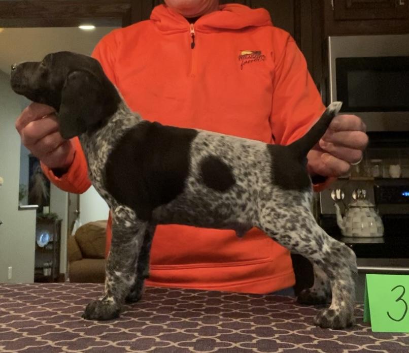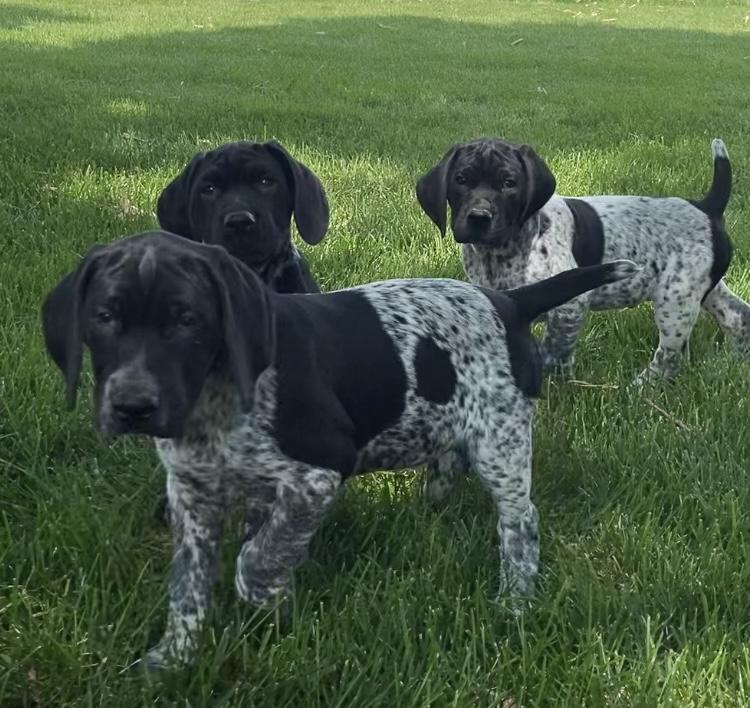 My husband and I have had four German Shorthaired Pointers and we absolutely LOVE the breed. We lost our beloved Kenny to bone cancer on February 1st. I immediately started looking for a GSP breeder. I contacted Rod and was quite impressed with his knowledge and love for the breed also. He sent me pictures of the parent dogs along with puppy pictures from previous litters. He was easy to talk to and took his time speaking with me. He said he has been breeding GSPs for four years. Rod researches the bloodlines and pays extra close attention to the details; he knows what he is doing!! He called me as the puppies were being born on March 18th. We went to look at the puppies in April and chose one that our seven year old grandson seemed to favor a lot. This past Sunday we went to bring our wonderful puppy home. He is such a GOOD puppy!! He is laid back, easy going and well adjusted. My daughter is a professional dog trainer and I asked her what she liked best about our new puppy and her response was his chill. I wholeheartedly give Rod a rating of 5 stars. He is more than willing to work with you to find the right puppy!! All our previous GSPs were liver and white ticked but JJ is black and white. His solid black head looks and feels like black velvet.