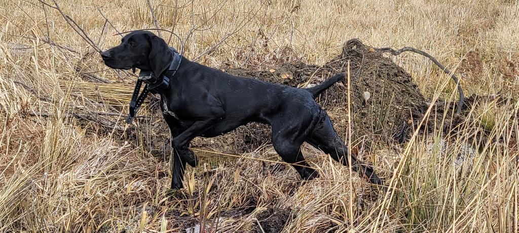 Lena shares her parents’ drive in the field with a fast pace and medium range (50-150 yards). She is a delight with my kids and other dogs and has successfully learned her job as a hunting guide dog.