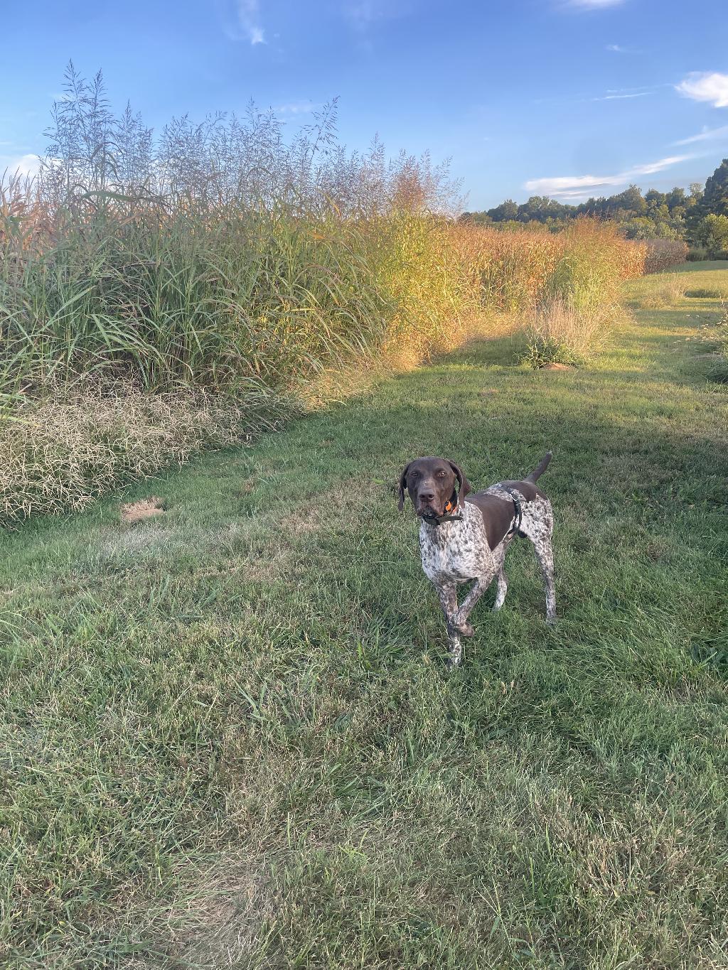 Well started German shorthair. He has pointed wild birds in Oklahoma,Kansas,Nebraska,Kentucky and Michigan. He stops on whoa, recall,recall to tone on collar, place and crate trained, retrieves but still parades a bit, down, sit. He need steadiness work, will break on wild birds sometimes… not every time. I’d say he bust birds about 40% of the time. Not aggressive to other dogs.
