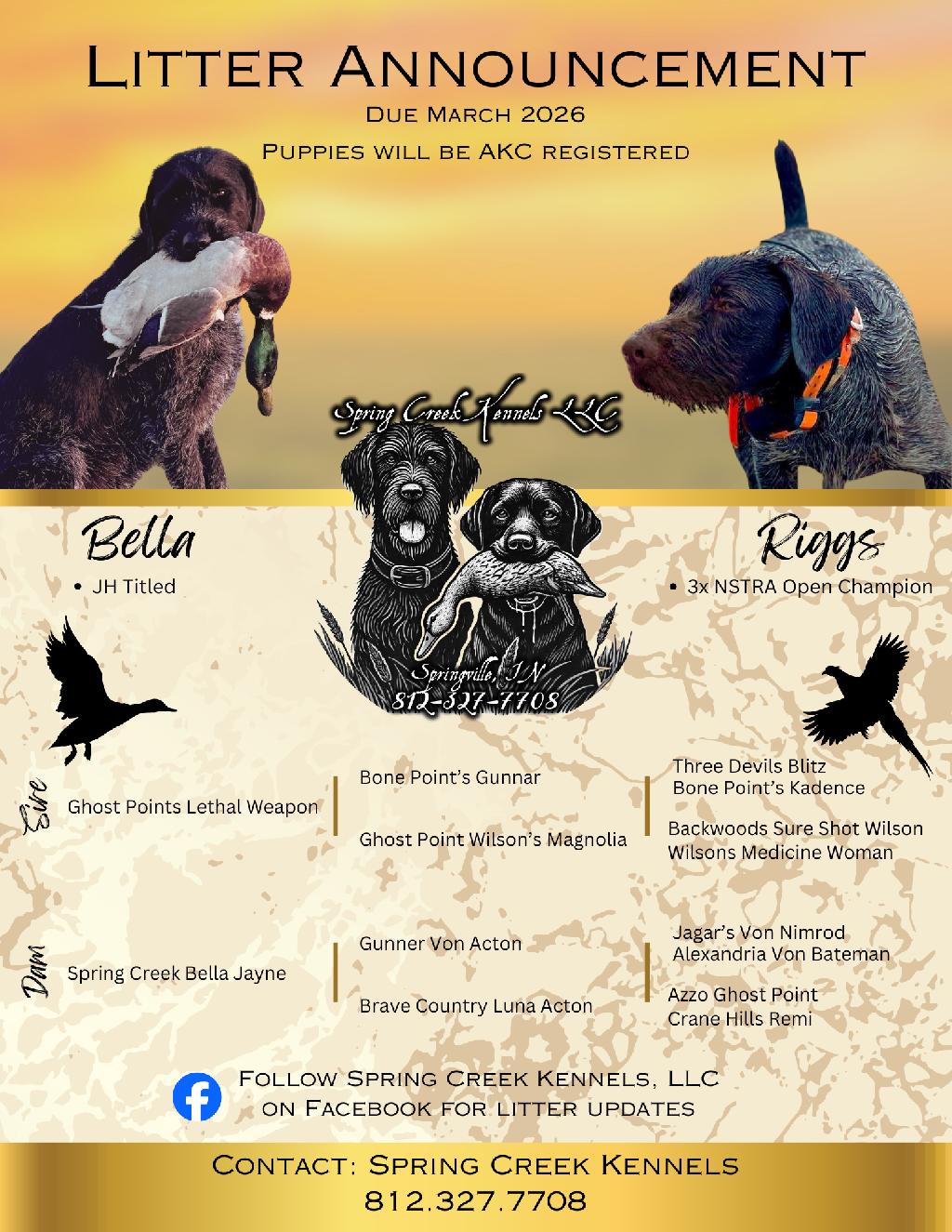 We’re excited to announce an upcoming German Wirehaired Pointer litter from Spring Creek Bella Jayne (“Bella”) × Ghost Points Lethal Weapon (“Riggs”).