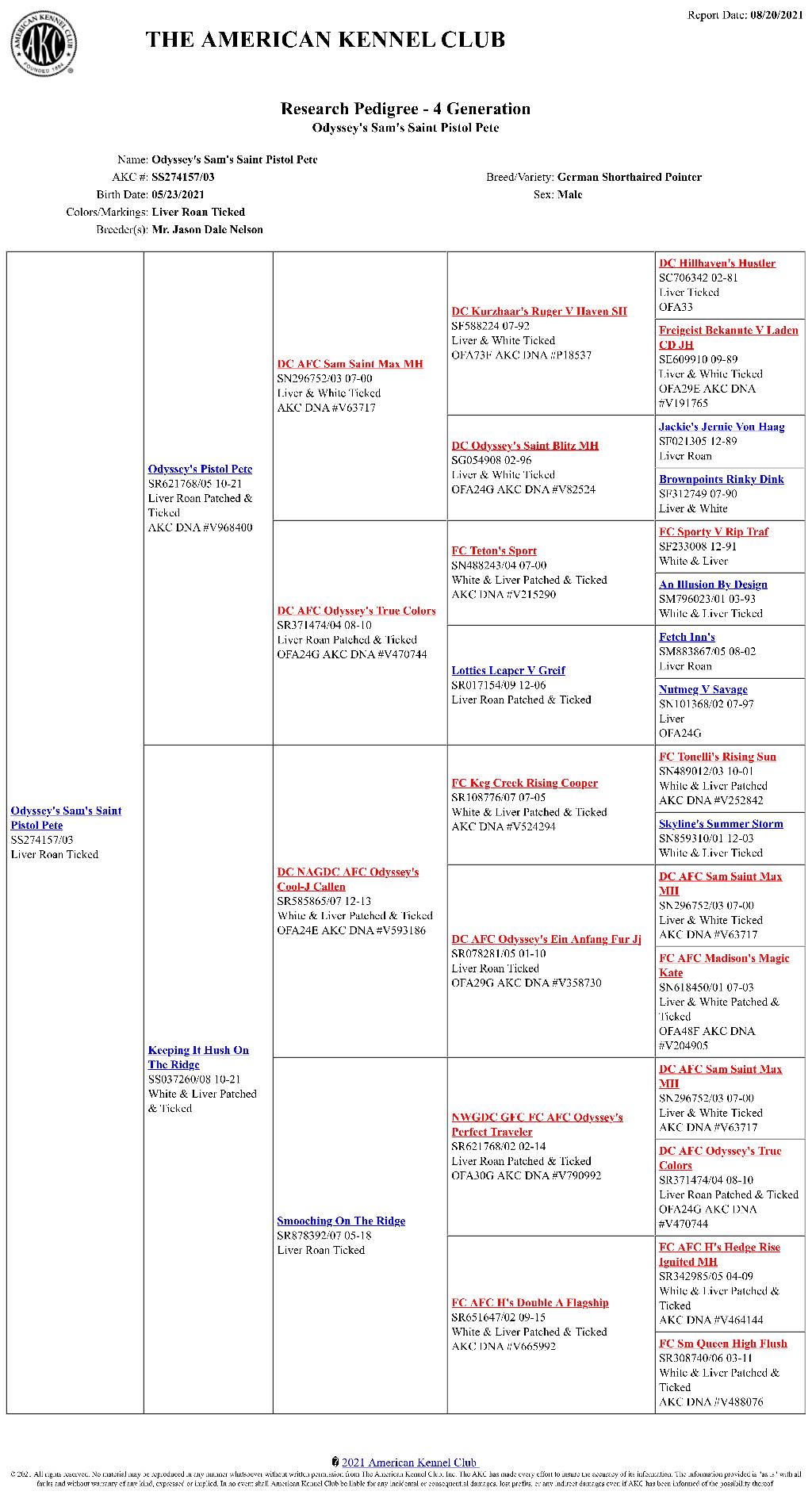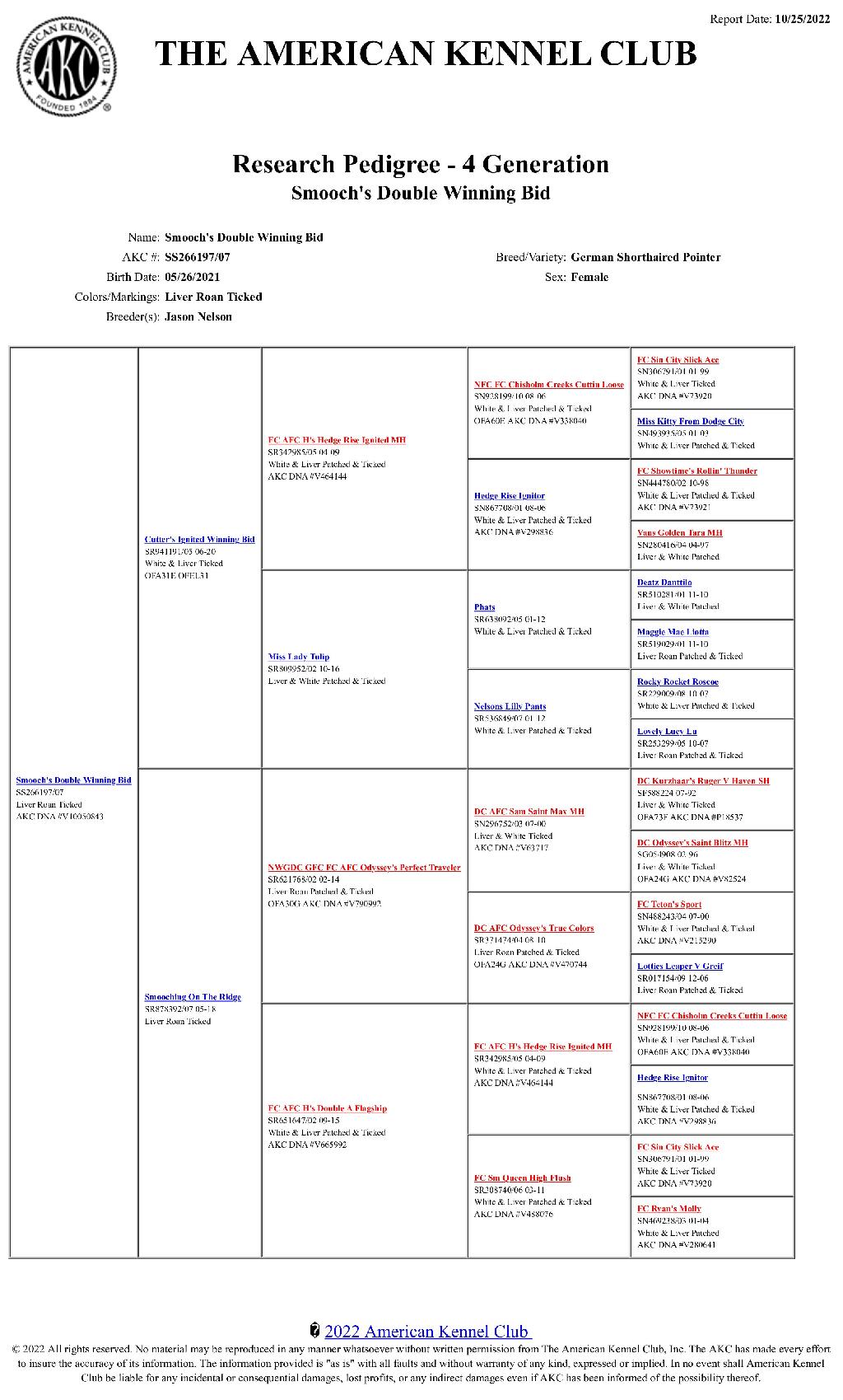 These puppies are from a terrific pairing of ODYSSEY’S SAM’S SAINT PISTOL PETE (PETE) x SMOOCH’S DOUBLE WINNING BID (SMOOCH). Both are beautiful dogs with extraordinary pedigrees, the best pairing we’ve had to date. Both are from awesome lines of AKC hunters out of Odyssey Kennels. Smooch has NWGDC GFC FC AFC Odyssey’s Perfect Traveler in her line. And Pete has DC NAGDC AFC Odyssey’s Cool-J Callen in his, among many other fine dogs in both pedigrees. These puppies are proof of that! They are beautiful and have super potential.