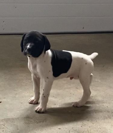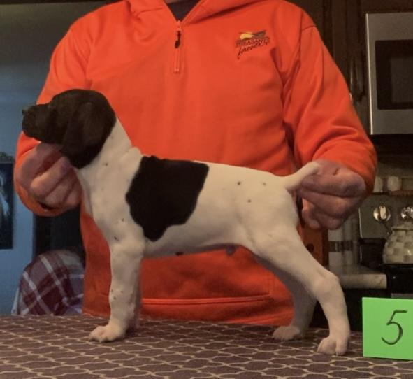 My husband and I have had four German Shorthaired Pointers and we absolutely LOVE the breed. We lost our beloved Kenny to bone cancer on February 1st. I immediately started looking for a GSP breeder. I contacted Rod and was quite impressed with his knowledge and love for the breed also. He sent me pictures of the parent dogs along with puppy pictures from previous litters. He was easy to talk to and took his time speaking with me. He said he has been breeding GSPs for four years. Rod researches the bloodlines and pays extra close attention to the details; he knows what he is doing!! He called me as the puppies were being born on March 18th. We went to look at the puppies in April and chose one that our seven year old grandson seemed to favor a lot. This past Sunday we went to bring our wonderful puppy home. He is such a GOOD puppy!! He is laid back, easy going and well adjusted. My daughter is a professional dog trainer and I asked her what she liked best about our new puppy and her response was his chill. I wholeheartedly give Rod a rating of 5 stars. He is more than willing to work with you to find the right puppy!! All our previous GSPs were liver and white ticked but JJ is black and white. His solid black head looks and feels like black velvet.