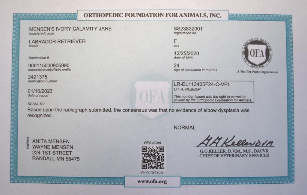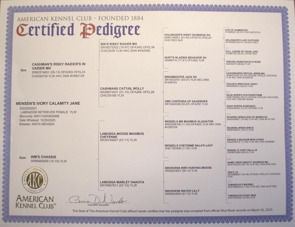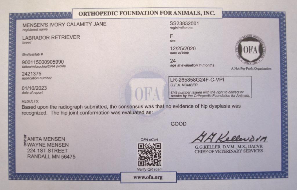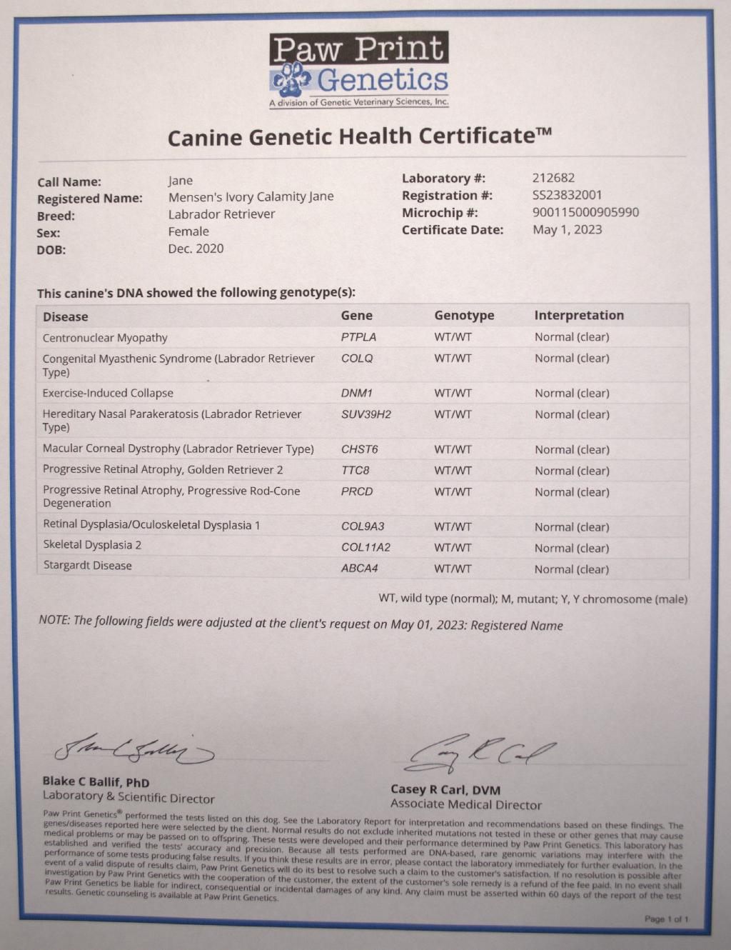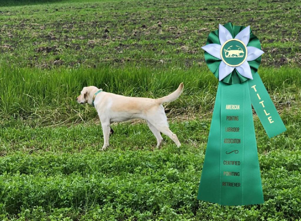 Jane is the daughter of a 4 Time Grand Master Pointing Retriever. She earned her Certified Pointing Retriever title June 2025. She has a beautiful natural point. She has a nice calm demeanor and has always been very good with the adults and children who came to visit her puppies (she had 2 litters). She was planned to be my primary female for breeding for many years, until she tore her uterus giving me a litter a year ago. Fortunately I was able to keep two of her daughters to continue my breeding program. Jane has OFA good hips and normal elbows. She is also clear/normal on several genetic tests, to include EIC (see attached pictures). She loves people and fetching. She has some experience with chuckars, pheasants, and ducks. She has spend some time in the house, but is mostly in our indoor/outdoor kennel building. #gundogs#gundogcentral#huntingdogs#sportdog#fielddog#dogsofgundogcentral#labradorretriever#starteddogs#yellow#forsale#gundogsforsale#huntingdogsforsale#female#randall#minnesota