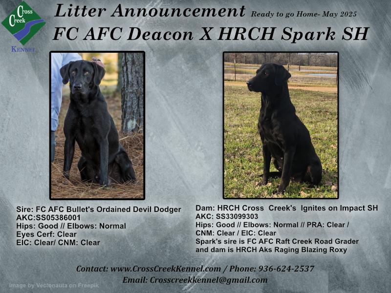 black male available. priced reduced. FC AFC Deacon X HRCH Spark SH Whelped 4/1/2025 Black Males Available FC AFC Bullets Ordained Devil Dodger has 28 Derby Points including 3 Derby Wins and National Derby List. Earned a Second Place finish in his 2nd Qualifying Stake to become QAA before 2 years old. Deacons sire by 14 NFC AFC Robbers Stray Bullet and out of AFTCH Banana Who QAA Finished/JAMd the first Open he ever entered, earned a 2nd Place in his third Open and a Win/1st in the fourth Open. Qualified for both the Nation Am and National Open before the age of 4 in 2021. AFC at 4.5 years old and FC at 5.7. Deacon has also qualified for the 2022, 2023 and 2024 NARC and 2023 NRC. 99.9% Amateur trained and handled. OFA Hips: Good, Elbows Normal, Eyes Clear, CNM/EIC/PRA: Clear