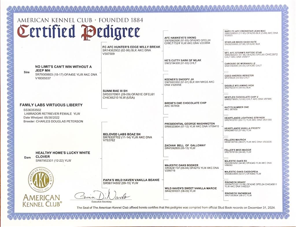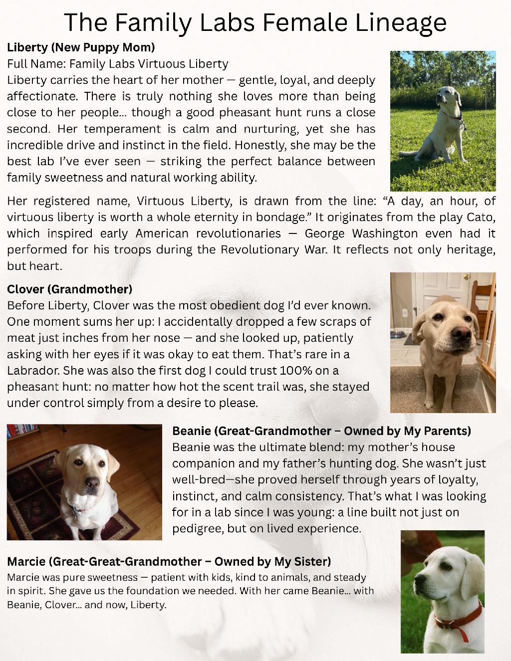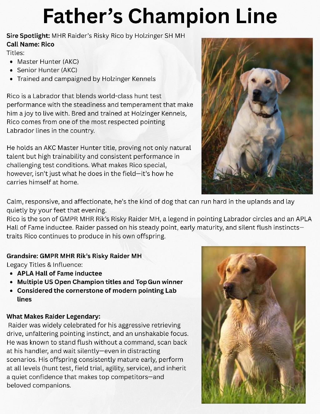 Liberty is our fourth-generation female - gentle, steady, and instinctively talented in the field. Shes been paired with Rico, a titled Master Hunter whose father, Riks Risky Raider, is a Hall of Fame pointing Lab. This litter is a fusion of field trial heritage and family-raised heart.