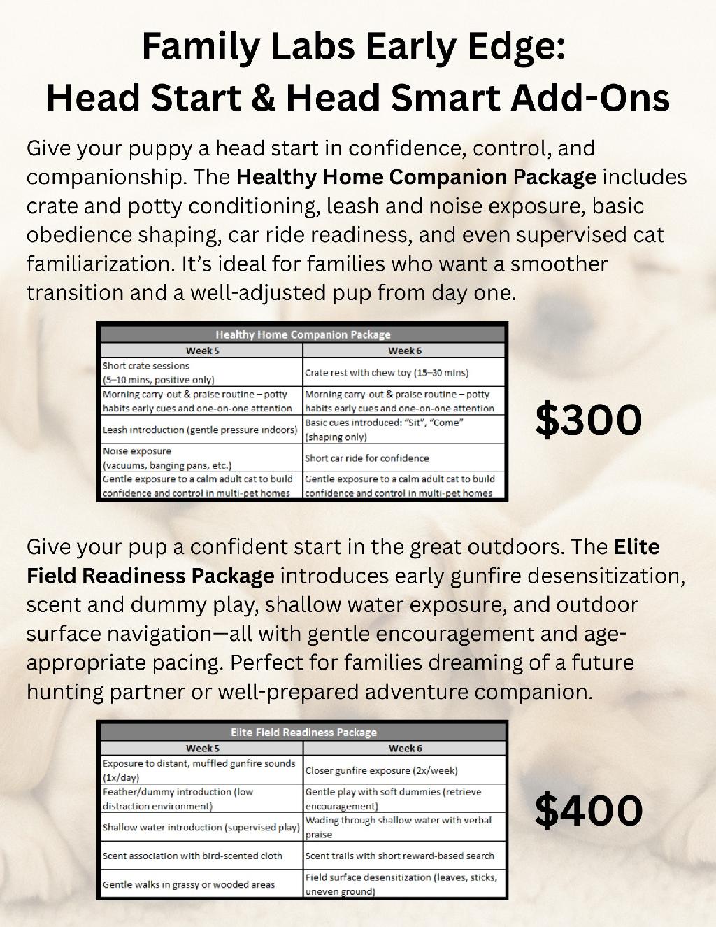 Perfect for families planning to hunt, trail, or work with their dog in the field. Introduces puppies to feathers, water, scent trails, and light field conditioning.
