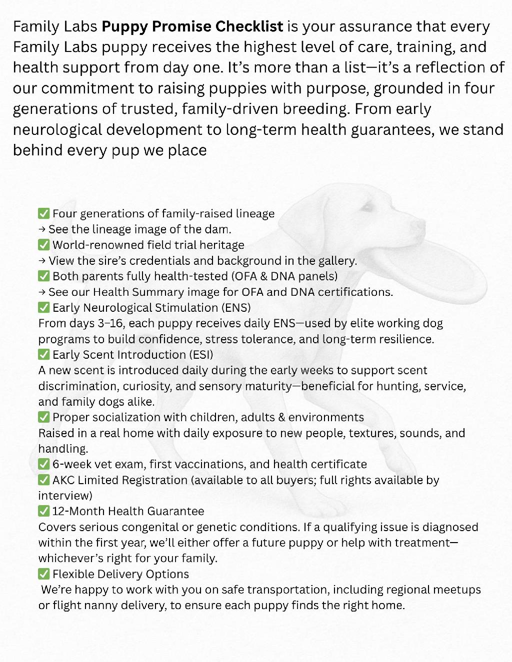 Every Family Labs puppy comes with a written 12-month health guarantee covering serious genetic or congenital conditions that significantly affect quality of life. We can provided specifics regarding the guarantee if you are interested.