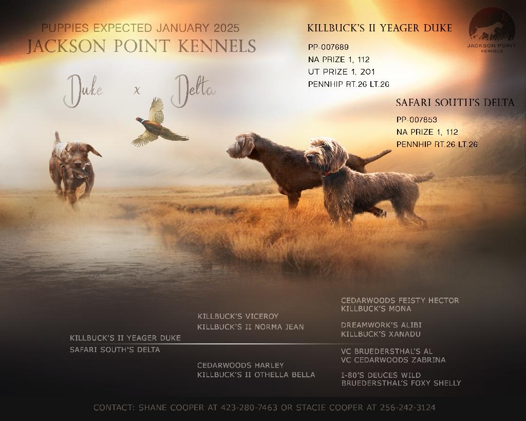 Jackson Point Kennels is thrilled to announce the upcoming litter of Killbucks II Yeager Duke (Duke) and Safari South’s Delta (Delta). Both parents boast impressive pedigrees and exceptional performance records, making this an extraordinary pairing for hunting enthusiasts and lovers of versatile dogs.