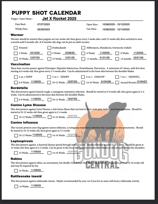 Keeping up with your puppy’s vaccination schedule gives them a strong start in life. Combine timely shots with regular vet visits, parasite prevention, and good nutrition, and you’ll be setting the foundation for a long, healthy partnership in the field and at home.