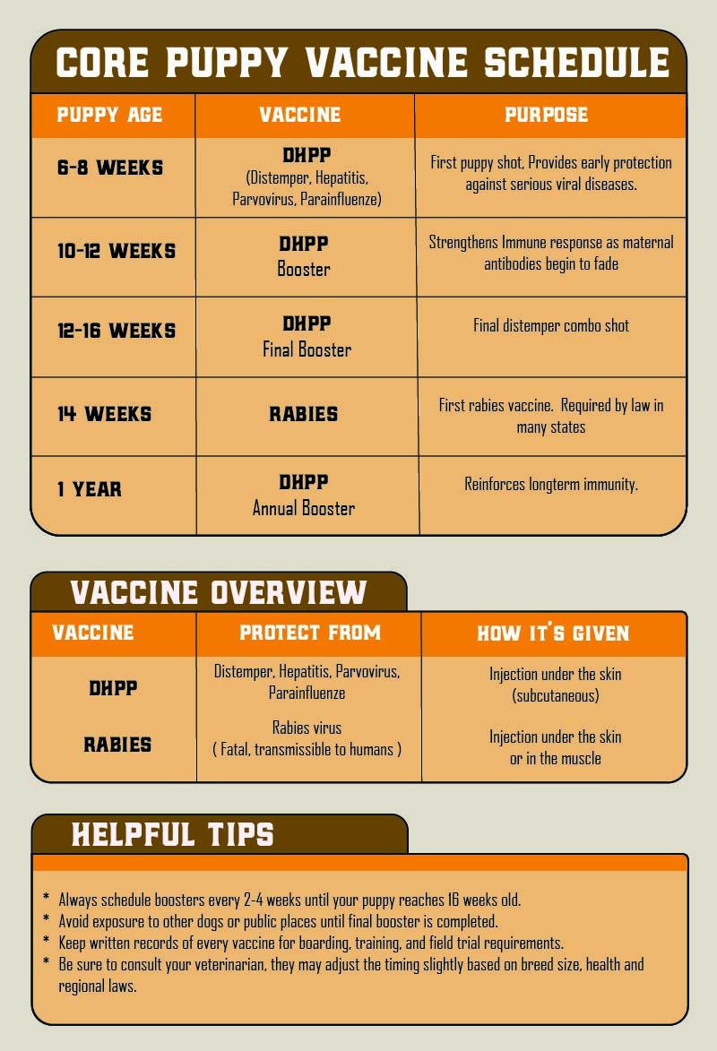The first core vaccine most puppies receive is the DHPP combination shot. This stands for Distemper, Hepatitis, Parvovirus, and Parainfluenza. Each of these viruses can cause severe illness: distemper attacks the nervous system and lungs, hepatitis damages the liver, parvovirus causes deadly intestinal infections, and parainfluenza contributes to respiratory disease. Puppies typically begin the DHPP series around six to eight weeks of age, with boosters given every three to four weeks until they are about sixteen weeks old. After that, a booster is given at one year, and then every three years to maintain protection.