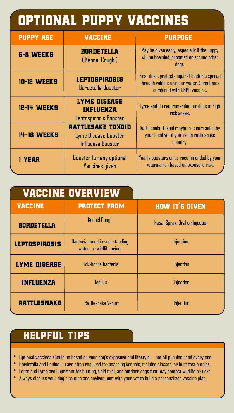 In addition to the core vaccines that every puppy should receive, there are several optional, or “non-core,” vaccines that may be recommended based on your dog’s lifestyle, environment, and risk of exposure. These vaccines aren’t required for all dogs but can provide important protection if your puppy is likely to encounter certain diseases. Your veterinarian can help determine which of these shots are appropriate for your puppy’s routine.