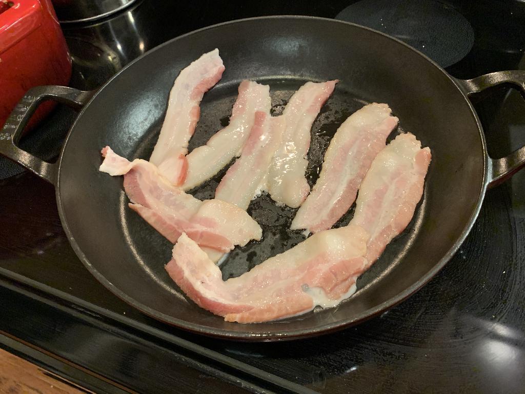 Step #4 In 8 to 10 inches skillet. Cut your bacon in half and cook until crispy.