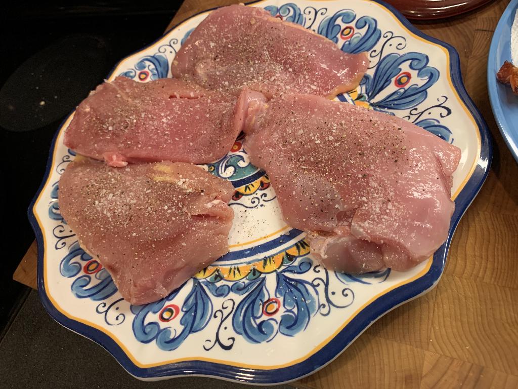 Step #5 While Bacon is cooking, remove the skin from Pheasant Breast and generously salt and pepper both sides.