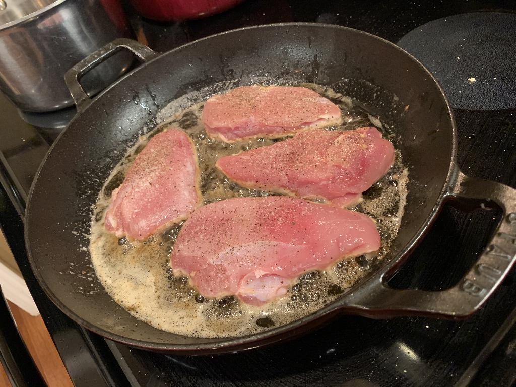 Step #7 Leave the bacon grease in the skillet, we'll use it to cook the pheasant breast. Place each pheasant breast in the skillet and cook each side of the breast about 4 to 5 minutes, until the internal temperature reaches between about 135 - 140 degrees. You don't want to cook all the way to 145 degrees, because this dish will go in the over for 20 minutes at the end, when all the ingredients are combined.