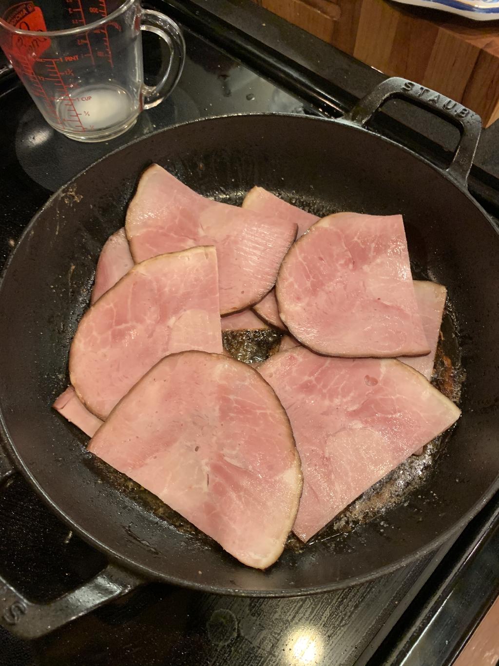 Step #9 Place the ham in the hot skillet and allow it to cook. You may find that your ham creates a lot of water, you may need to drain some of the water that collects in the pan, if you want your ham to brown.