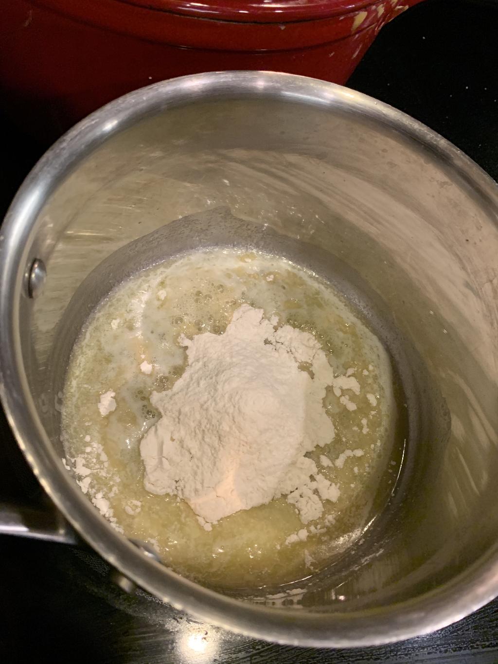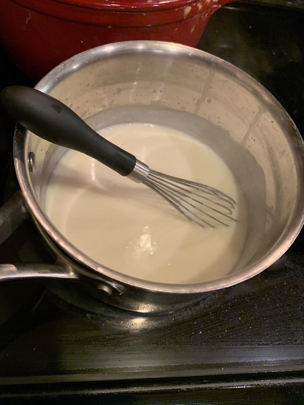 Step #10 While the ham is cooking, let's start our bechamel sauce. In a large saucepan, melt 4 tablespoons of butter. Once the butter is melted, 1/4 cup of all-purpose flour, stirring to combine. Allow to cook for 2 minutes and pour in your warm milk. Stirring continuously until it just started to thicken.