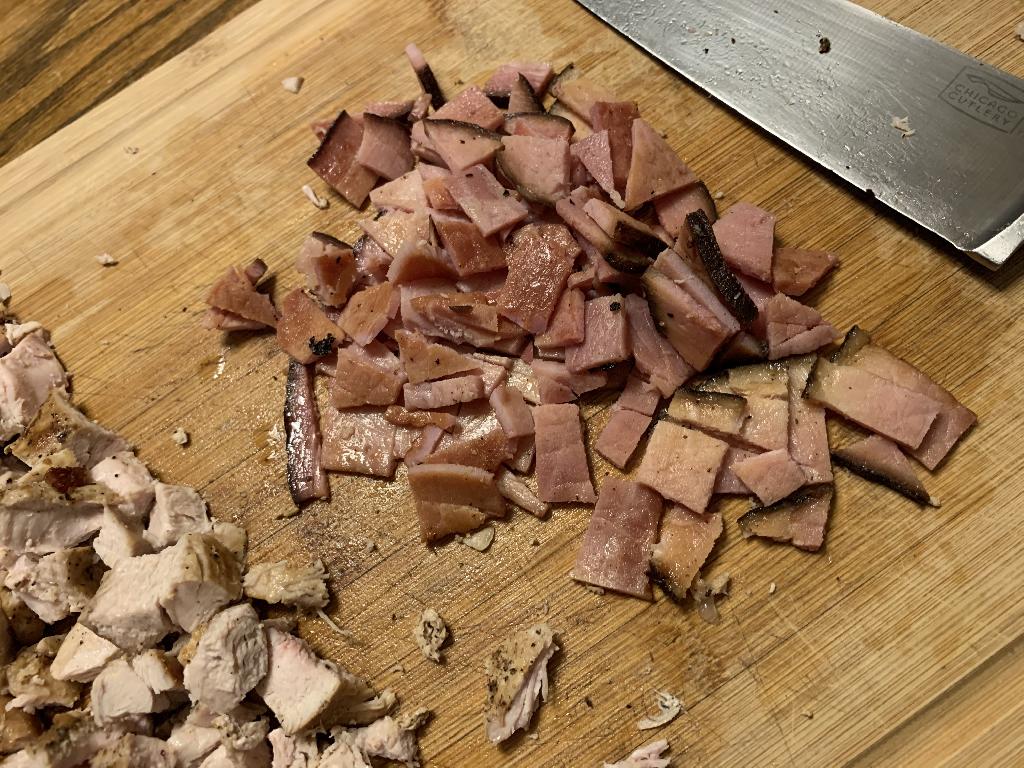 Step #12 Cut your pheasant breast and ham into small bite size chunks. Like 1/4 inch in length.