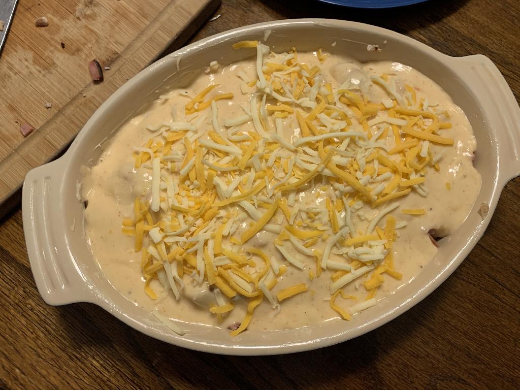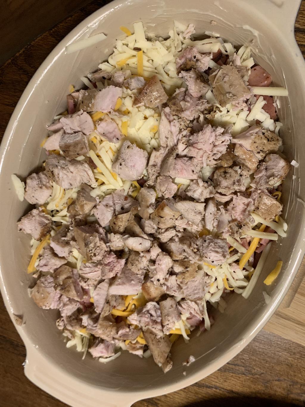Step #14 Start your dish by placing a half of your Pheasant down in the bottom of the casserole dish. Followed by half of your Ham. Cover the ham with 1/2 cup of White Vermont Cheddar, followed by 1/2 cup of Monterey Jack Cheese. Follow this with the rest of your Pheasant, followed by the rest of your Ham. Then another 1/2 cup of Vermont Cheddar and 1/2 cup of Monterey Jack.