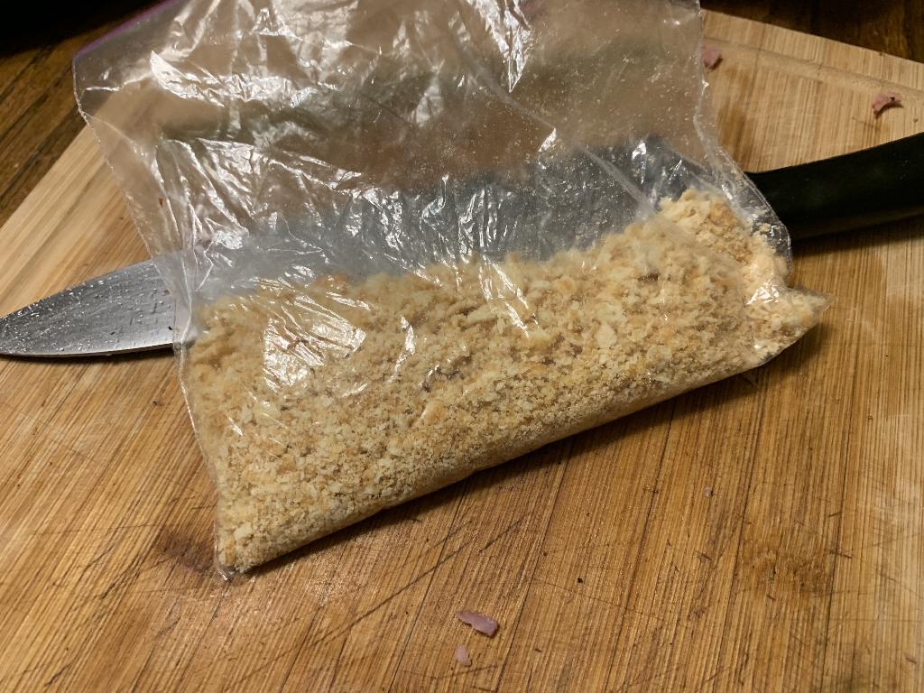 Step #16 Put 24 Ritz crackers in a zip lock bag and crush them to pieces. It should make a fine cracker crumble. Melt 2 tablespoons of butter in the microware. Put your cracker crumbles in a bowl and pour hot butter over the top, using a fork to combine and fluff.