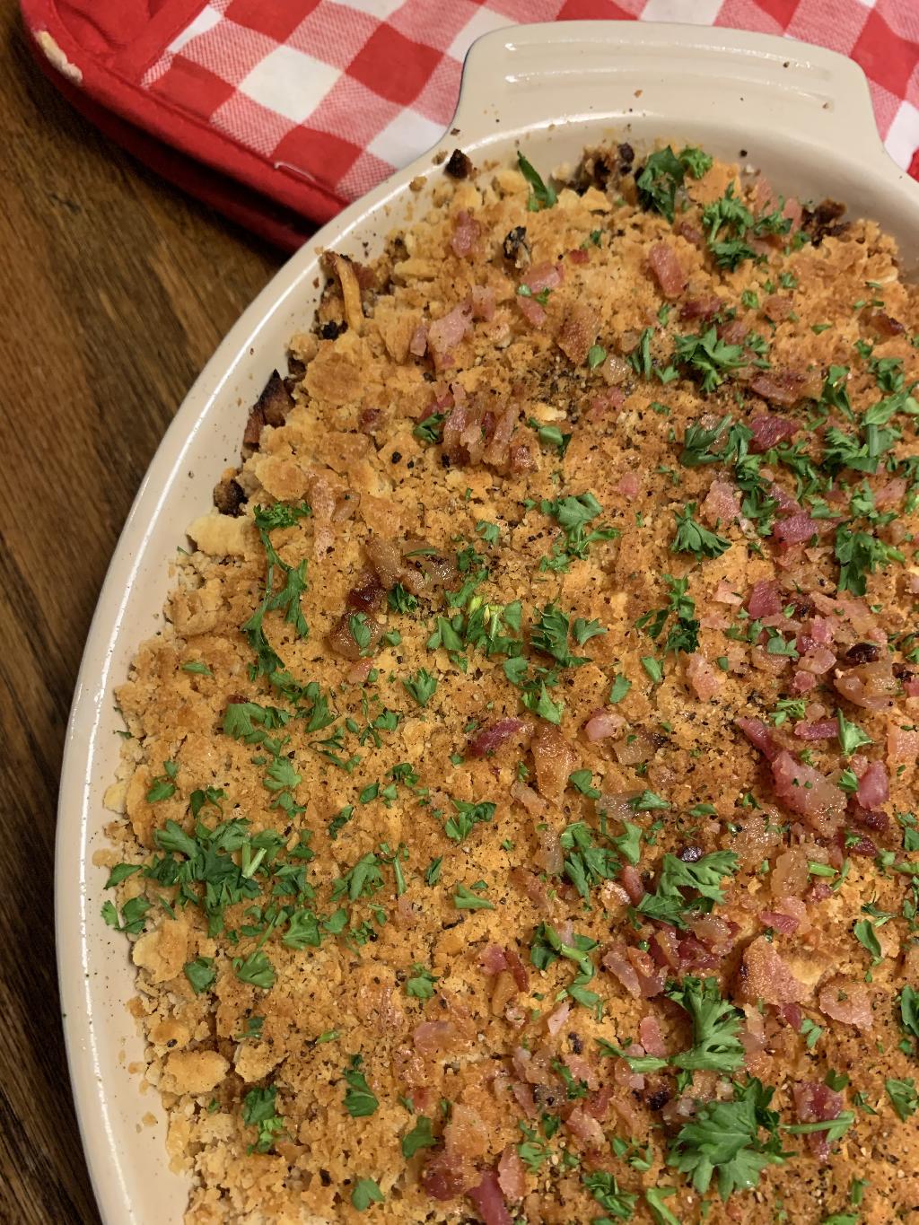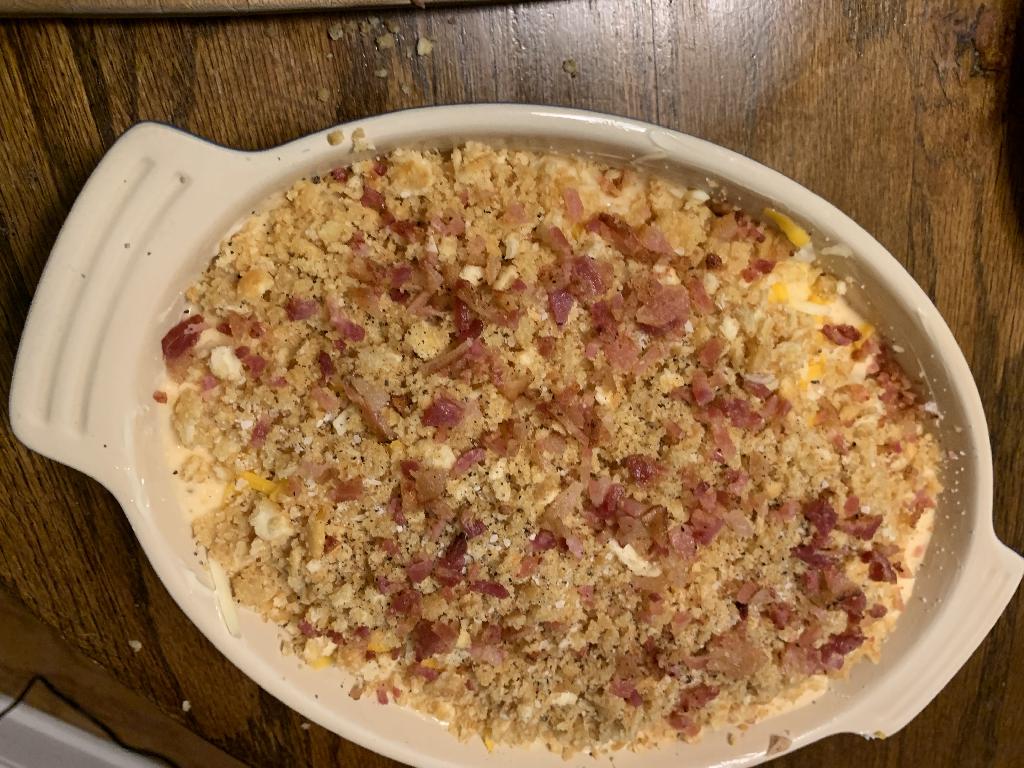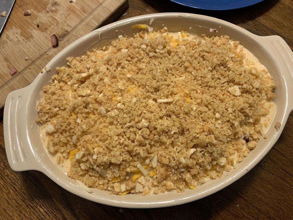Step #17 Take the Ritz cracker crumble and distribute it evenly over top of your casserole.