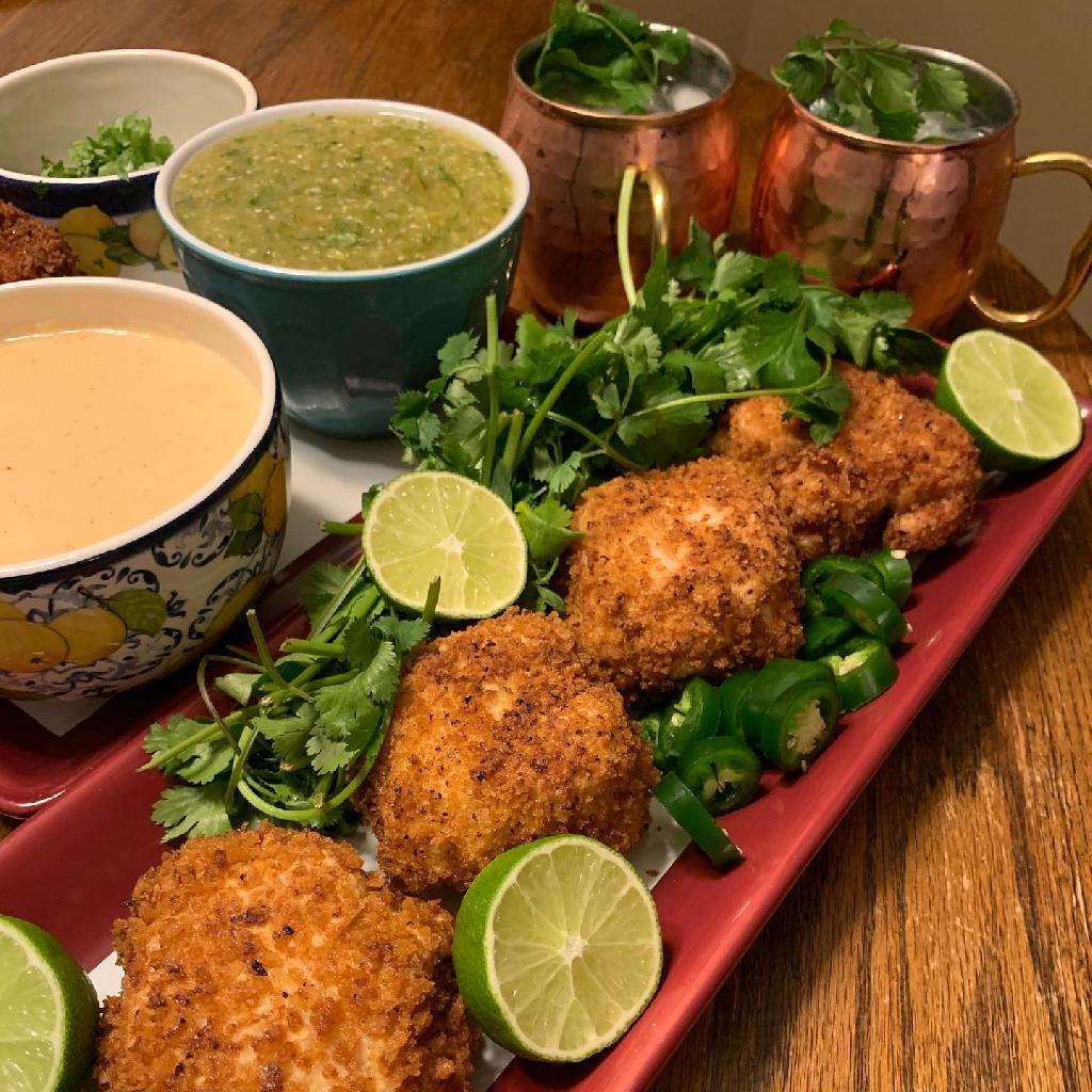 Traditional Chicken Kiev, is breast meat pounded flat with a dab of herbed butter placed in the center and folded up into a ball or rolled up into a log, so that the butter is sealed inside. It's then usually breaded on the outside and deep fried for a few minutes, then moved to the oven to finish. Once it's done, when you cut into it, flavored butter spurts out everywhere. The butter inside helps keep the meat moist and flavorful. I decided to put a Mexican twist on this dish, was Chili and Lime infused Panko breadcrumbs, Cilantro Lime butter, Mexican Rice with White Queso, Salsa Verde and a Jalapeno Cilantro Moscow Mule. You can use whatever flavors you like, but around here, we eat a lot of Mexican food. The little town we live in only has about 4500 people living in it, but there are at least three Mexican restaurants. Generally, after Karate class on Thursday night, a bunch of us will go to the Mexican restaurant to eat, it seemed only fitting that since karate class was the inspiration for this recipe that I include a Mexican twist. This recipe might seem difficult at first glance, but it's actually well worth the time. Don't be afraid to substitute whatever flavors are appealing to you, along with whatever sides you would prefer. This was my first attempt at making this dish and we were all very happy with the way it turned out. Hope you enjoy.