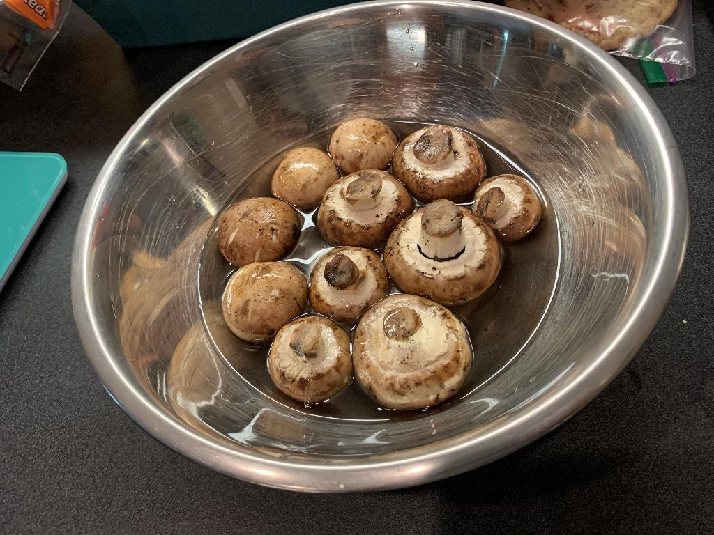 Step #2 While the quail is in the refrigerator, place the 6 oz of Baby Bella Mushrooms in a bowl of cool water to soak. This will help infuse the water with a Mushroom flavor, creating a kind of mushroom stock.