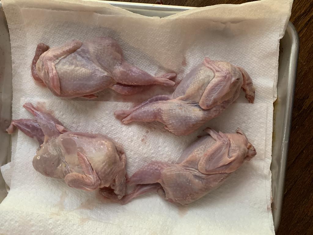 Step #3 Remove Quail from refrigerator, rinse and place on a swallow tray on a wire rack to dry. Place back in the refrigerator for one more hour.