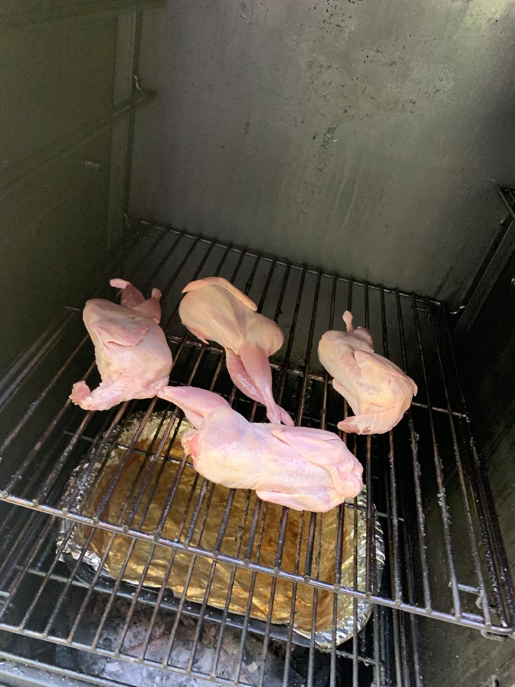 Step #4 After one hour, remove quail. Coat then with vegetable oil spray, then salt and pepper both sides. Fill your smoker drip pan with water and get the temperature of the smoker around 225. Smoke the quail using your favorite wood chips, I used pecan, for one hour or until the internal temperature is around 160-165.