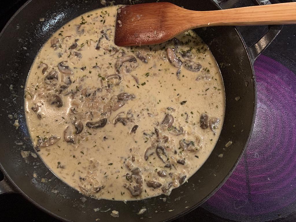 Step #14 Add chicken stock and mushroom water, then let simmer for 30 minutes.