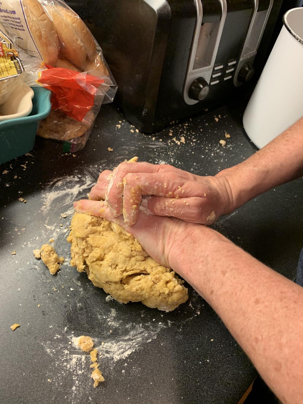 Step #4 Dump the dough onto a well-floured surface and knead for about 5 minutes with hands until the surface of the dough springs back when pressed in with your finger.