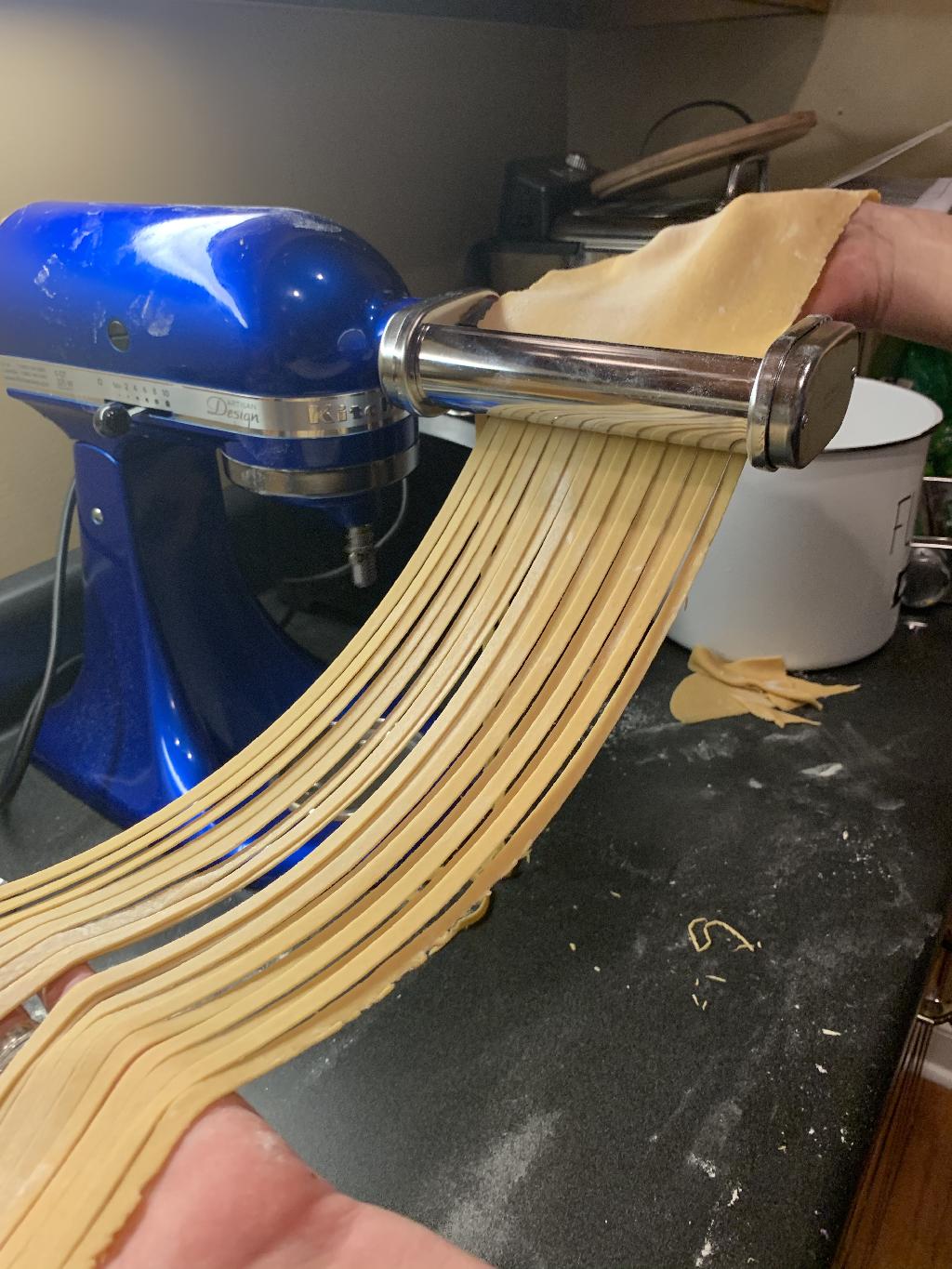 Step #7 Once we had a dough rolled, we changed attachments to Linguine attachment and ran our dough through that attachment on a speed of 5 1/2.