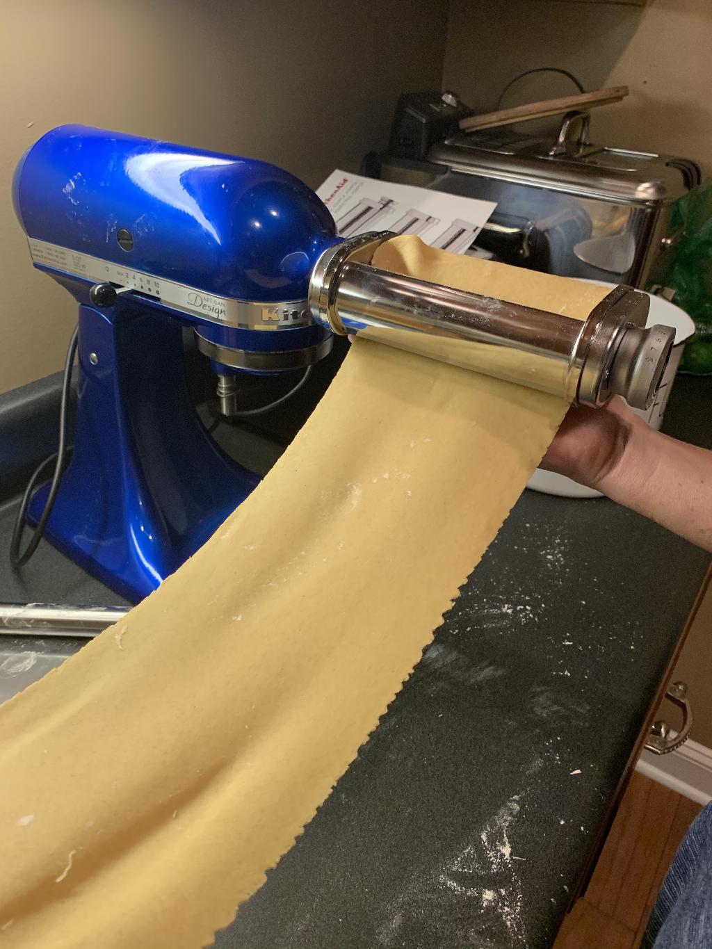 If you have a mixer with a pasta attachment, follow instructions for making your pasta. We have a Kitchen Aid. We gradually fed our dough through the mixer at the widest setting a few times, before stepping down to lower and lower settings, until we got the thickness we wanted.